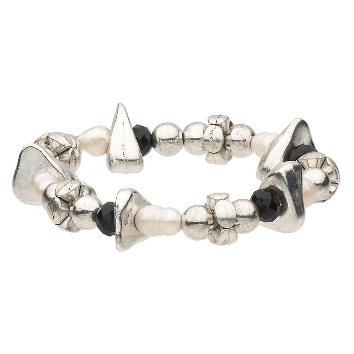 Bracelet is ready-to-wear or can be taken apart for supplies. Detailed bracelet includes white cultured freshwater pearls, black glass faceted rondelles, antique silver-finished rounds, rondelles, and triangle rondelles. Colors, shapes and sizes may vary in each lot.