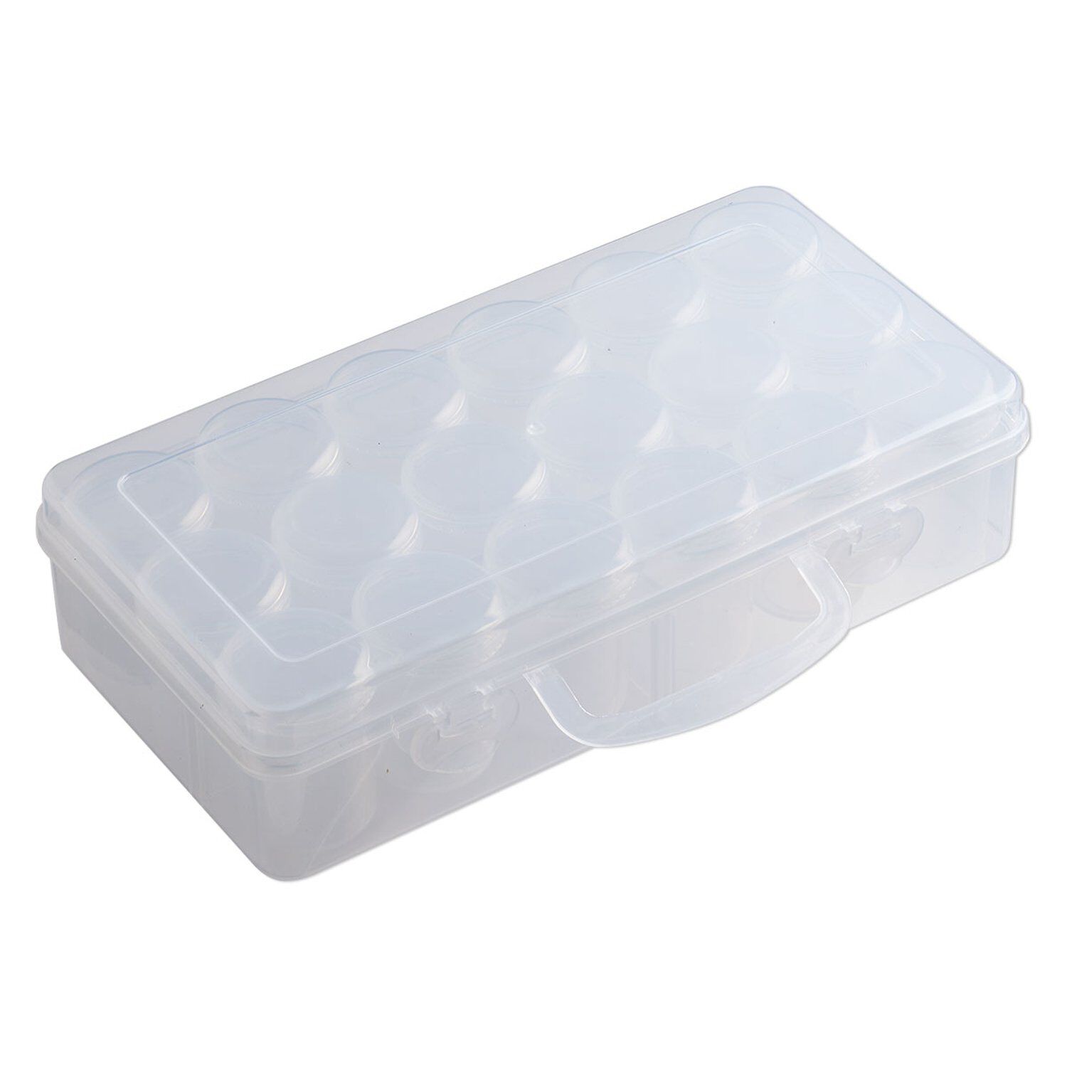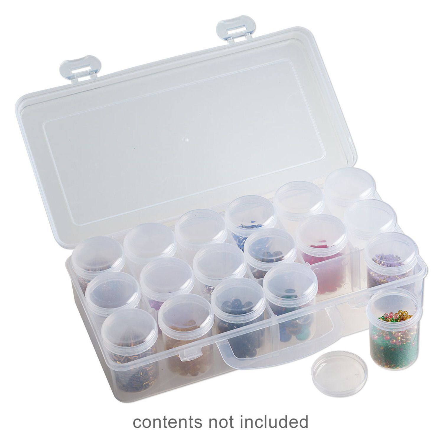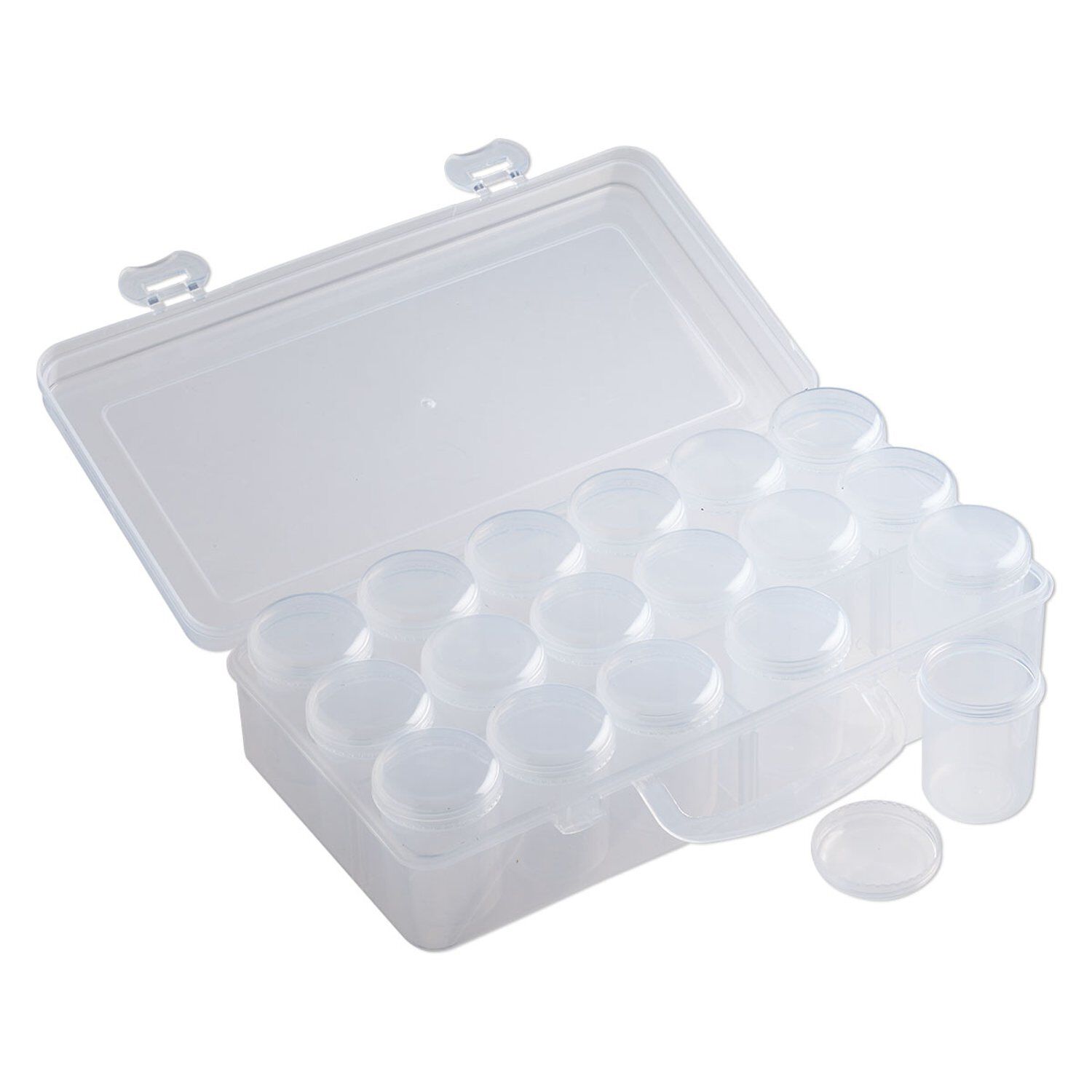 Durable clear plastic organizer with rounded corners stacks flat and saves space. Includes eighteen 1-1/2 x 2-inch removable clear round vials with twist-off lids. Two snap latches keep the hinged lid securely closed, while the handle allows for easy carrying. Ideal for beading on the go or storing component collections in small spaces.