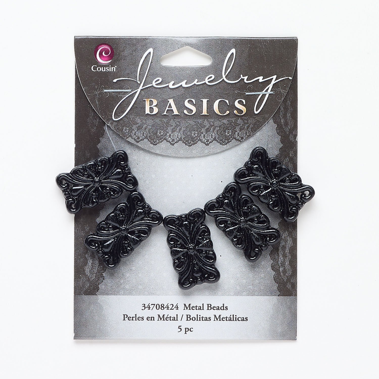 Bead, spacer 1pkg5, black-finished "pewter" (zinc-based alloy), 24x14mm 5-strand fancy rectangle, fits up to 5.5mm beads.
