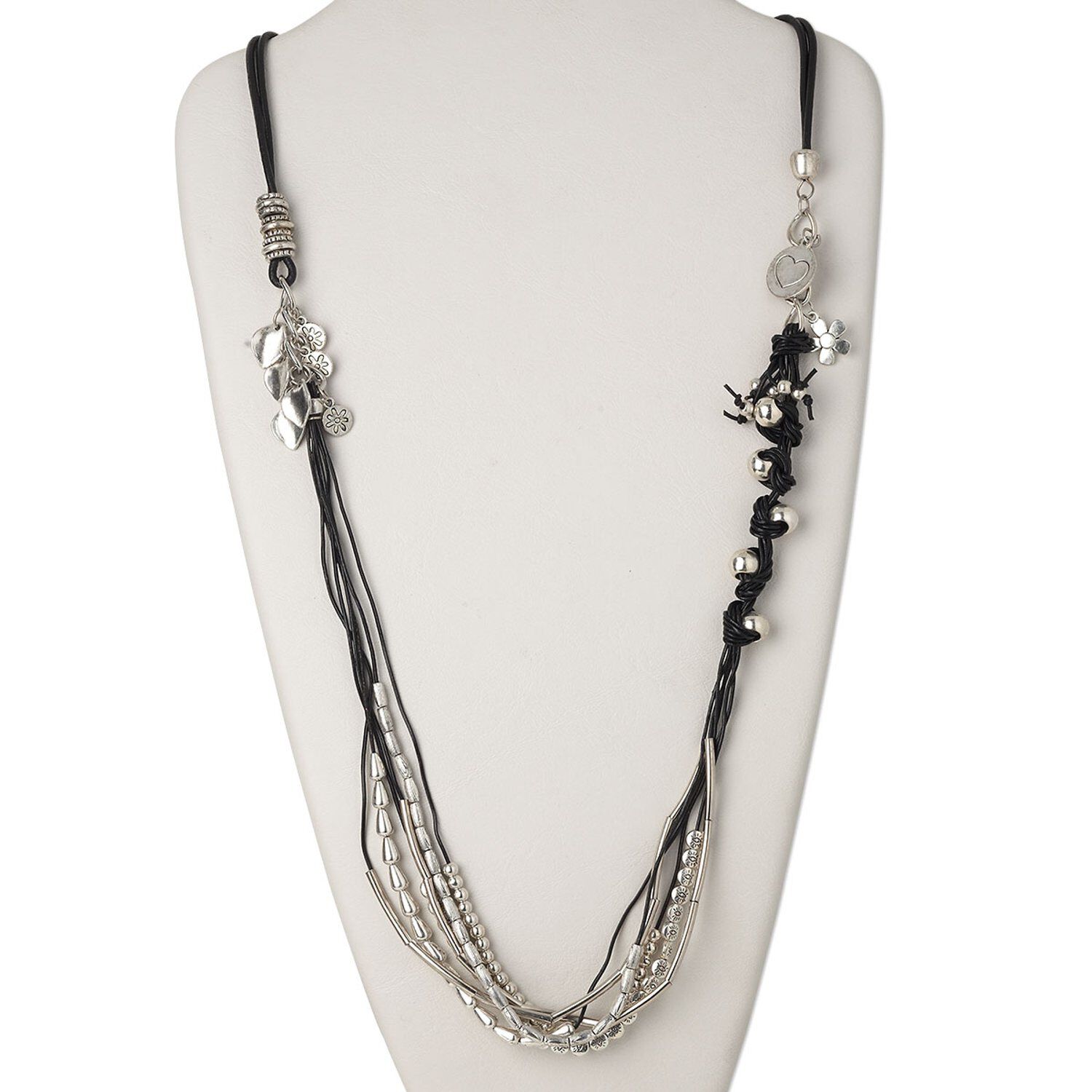 Necklace, multi-strand, antiqued silver-finished "pewter" (zinc-based alloy)/leather/steel, black, 36 inches. Sold individually.