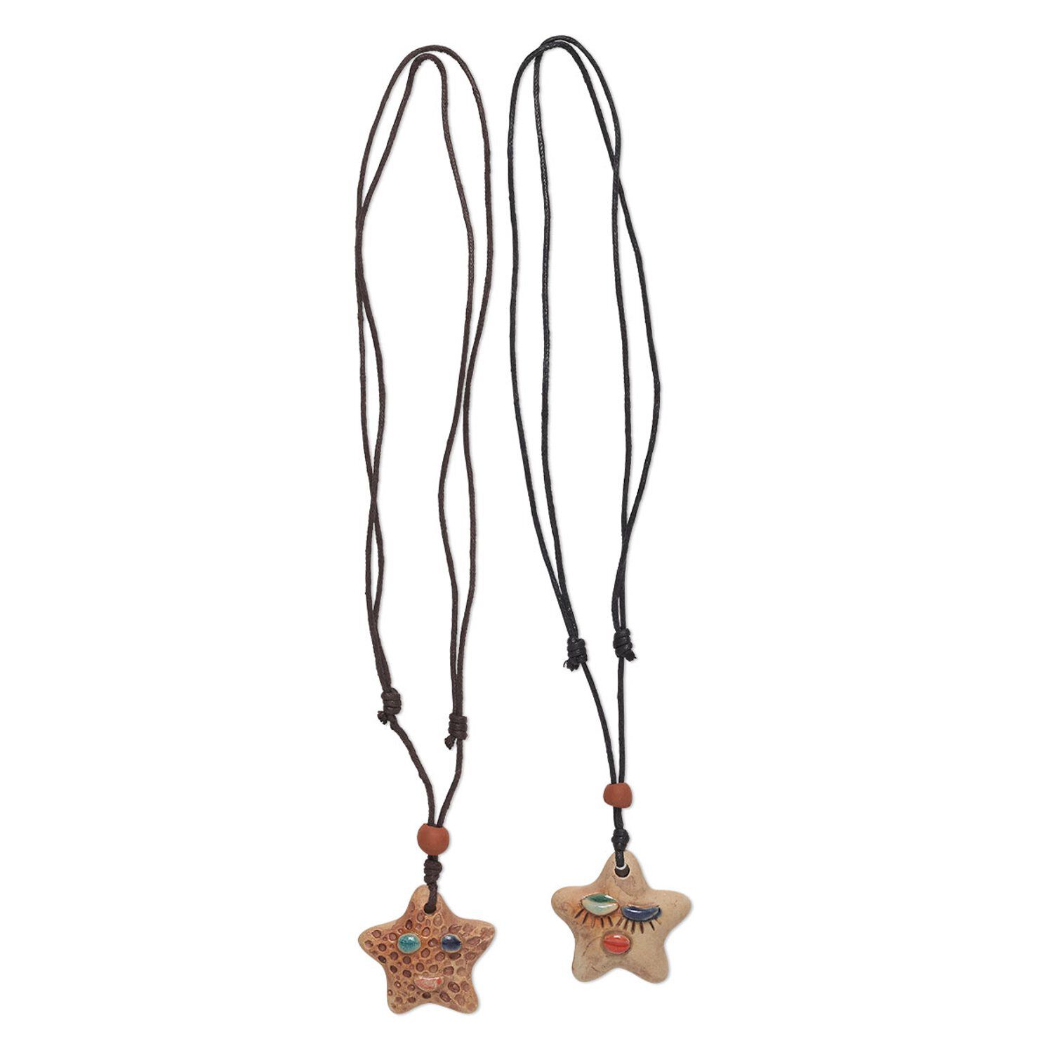Hand-painted star pendants with whimsical facial features are made of porcelain from Chaozhou, China. Both star pendants are strung on dyed waxed cotton cord. Testing for colorfastness is recommended. The slip-knot styles are adjustable to 32 inches. Colors can include black, brown, green blue, red and more.
