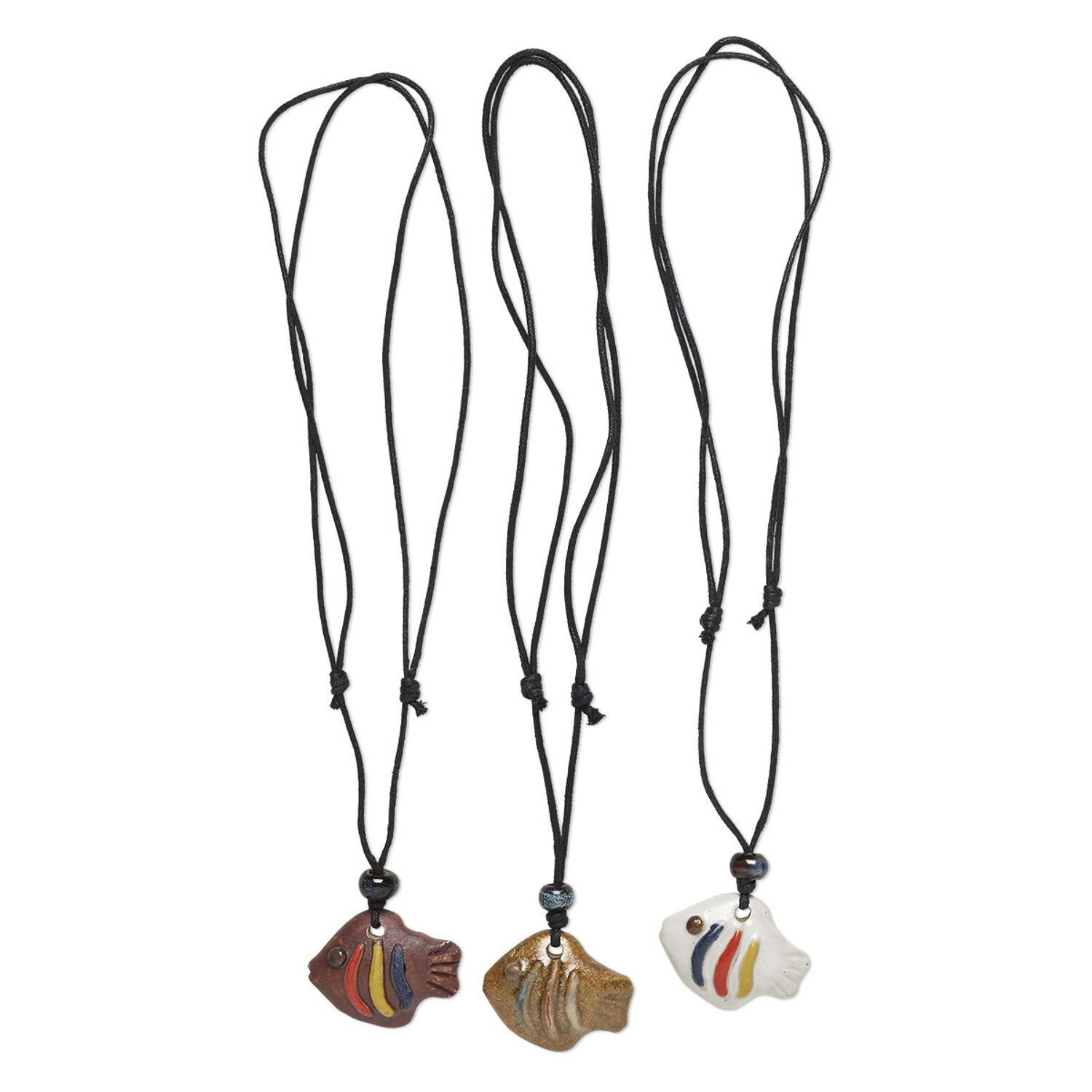 Hand-painted fish pendants are made of porcelain from Chaozhou, China. Pendants are strung on dyed waxed cotton cord. Testing for colorfastness is recommended. The slip knot styles are adjustable from 16 to 32 inches. Colors can include white, brown, red, yellow, blue and more.