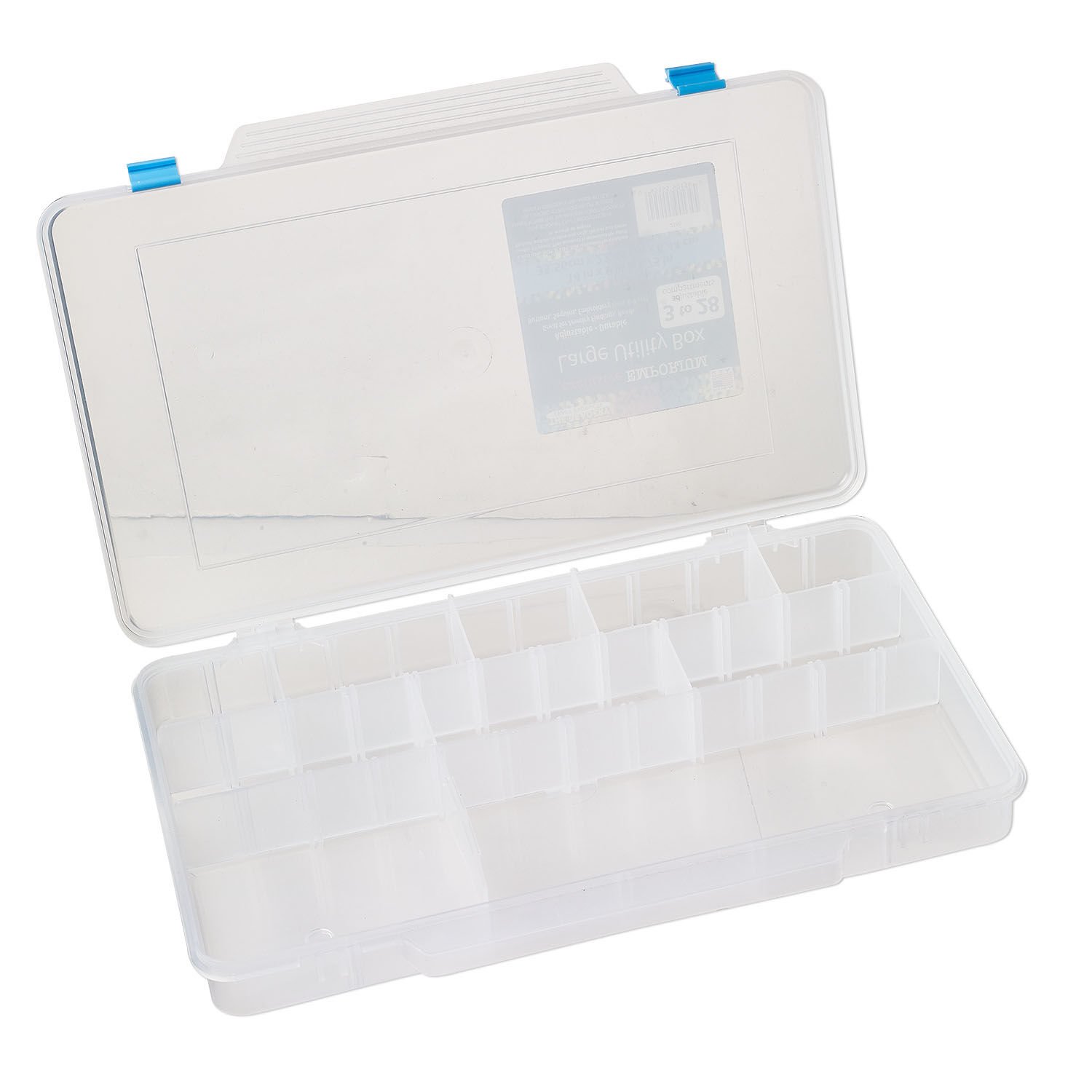 Organizer box, The Beadery®, 1pkg1, plastic, clear / blue, 14 x 9 x 1-3/4 inches with 3 to 28 adjustable compartments (2186).