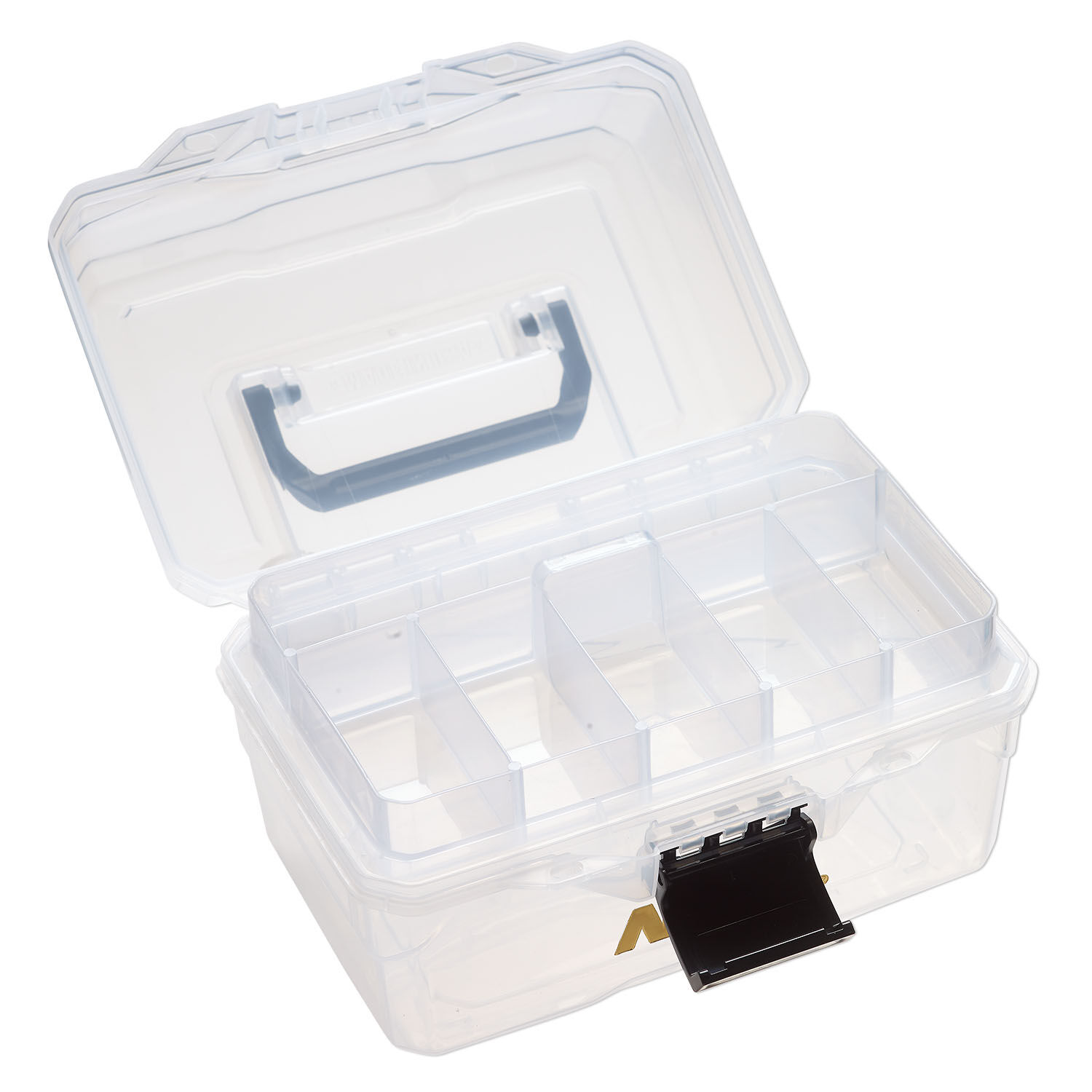 Organizer, ArtBin® tarnish inhibitor 1pkg1, polypropylene, clear and black, 9 x 5-1/2 x 6-3/4 inches, organizer box with removable tray with 6 fixed compartments.