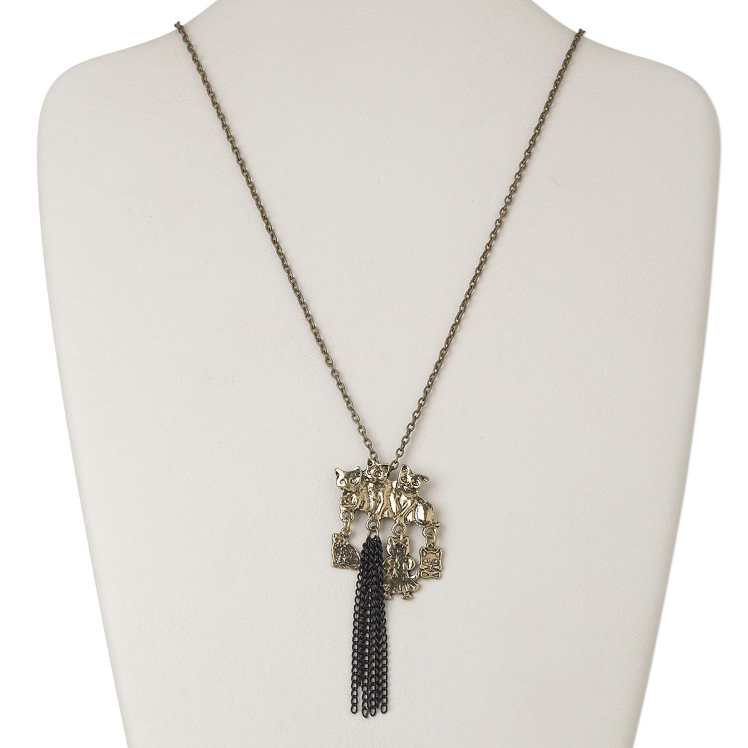 Necklace, antiqued brass-finished "pewter" (zinc-based alloy) and steel, black, 32x20mm cats, 32 inches with 2-1/4 inch dangle and lobster claw clasp. Sold individually.
