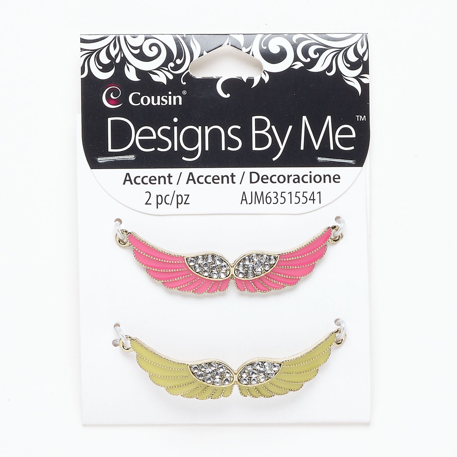Focal assortment 1pkg2, gold-finished "pewter" (zinc-based alloy) / acrylic / enamel, clear / pink / green, 50x12mm curved wing.