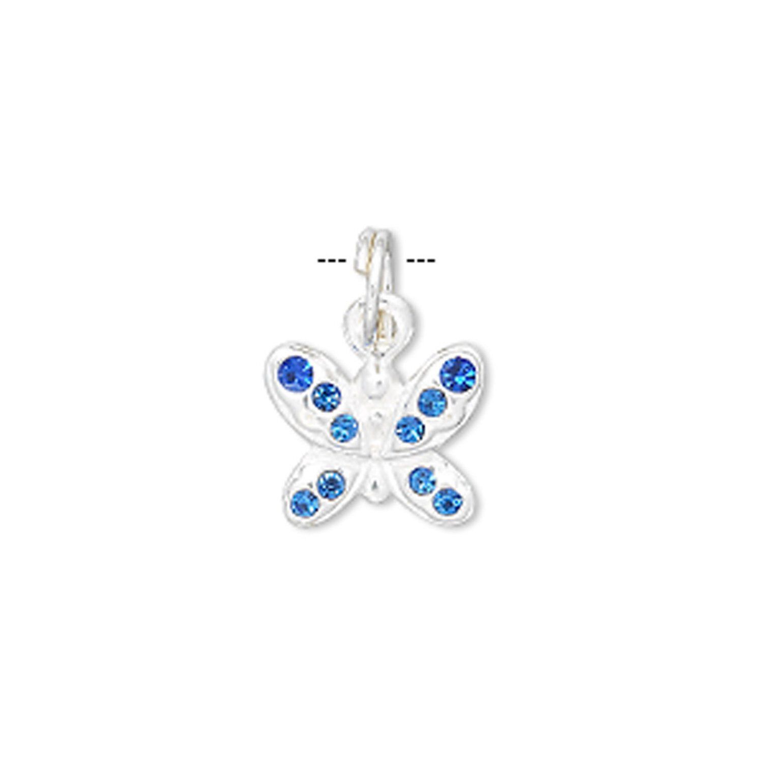 Charm, crystal and sterling silver, blue, 14x12mm butterfly. Sold individually.