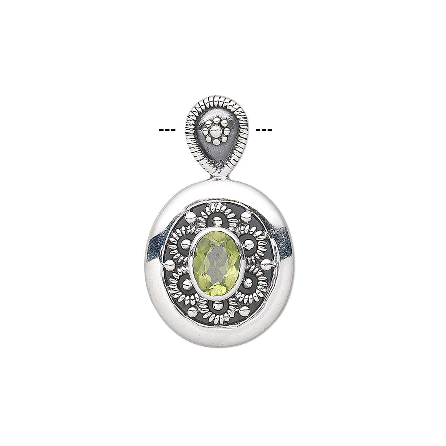 Pendant, peridot (natural) and antiqued sterling silver, 26x16mm oval with 8x6mm faceted oval. Sold individually.