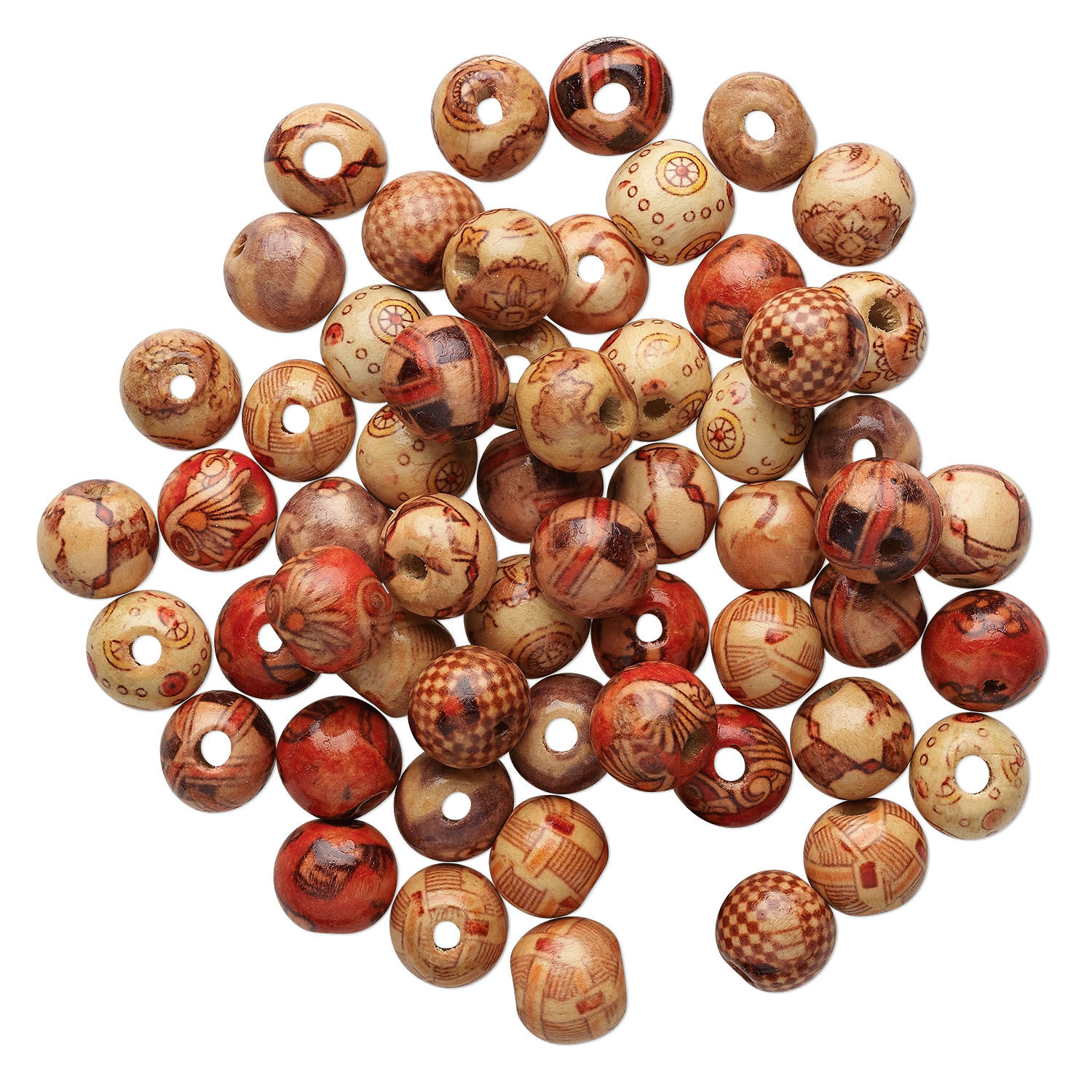 Lightweight wood beads feature delightful patterns and colors. Beads are finished with clear coat for durability and shine. Sizes, shapes and colors may vary with handcrafted items. Stringing holes may be temporarily blocked by drilling process debris; holes can be cleared with a bead reamer. Colors can include red, black, tan and more.