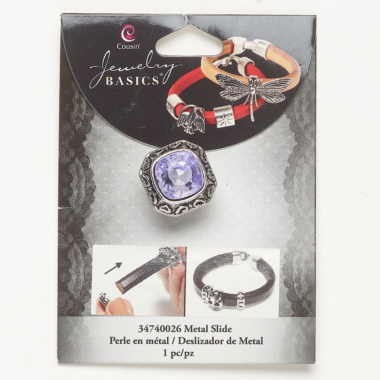Slider bead 1pkg1, antique silver-finished brass and acrylic, purple, 19mm fancy square with scroll.