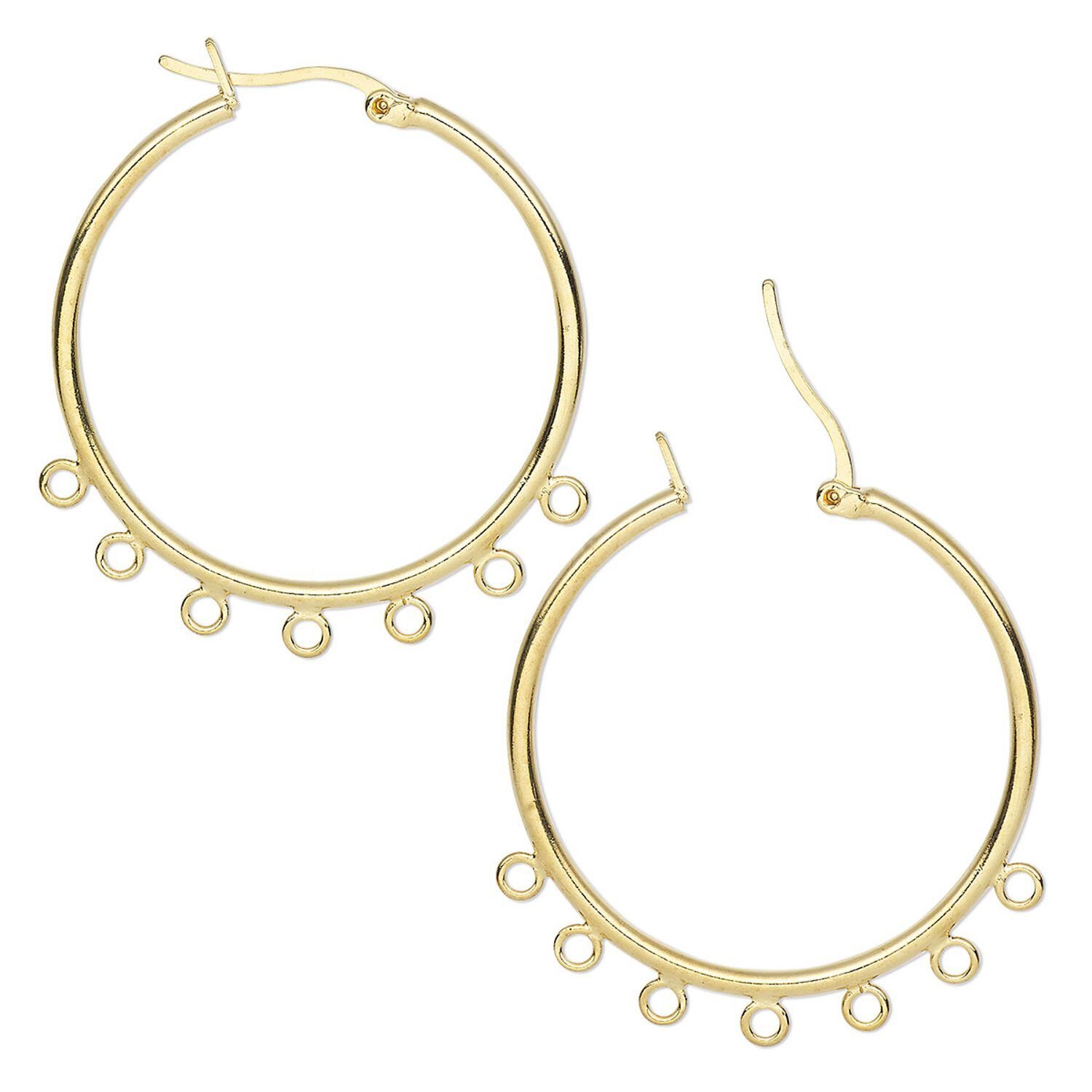 Earring hoop 1pkg10 gold-plated, 32mm round latch-back / 7 closed loop, brass 5 pair