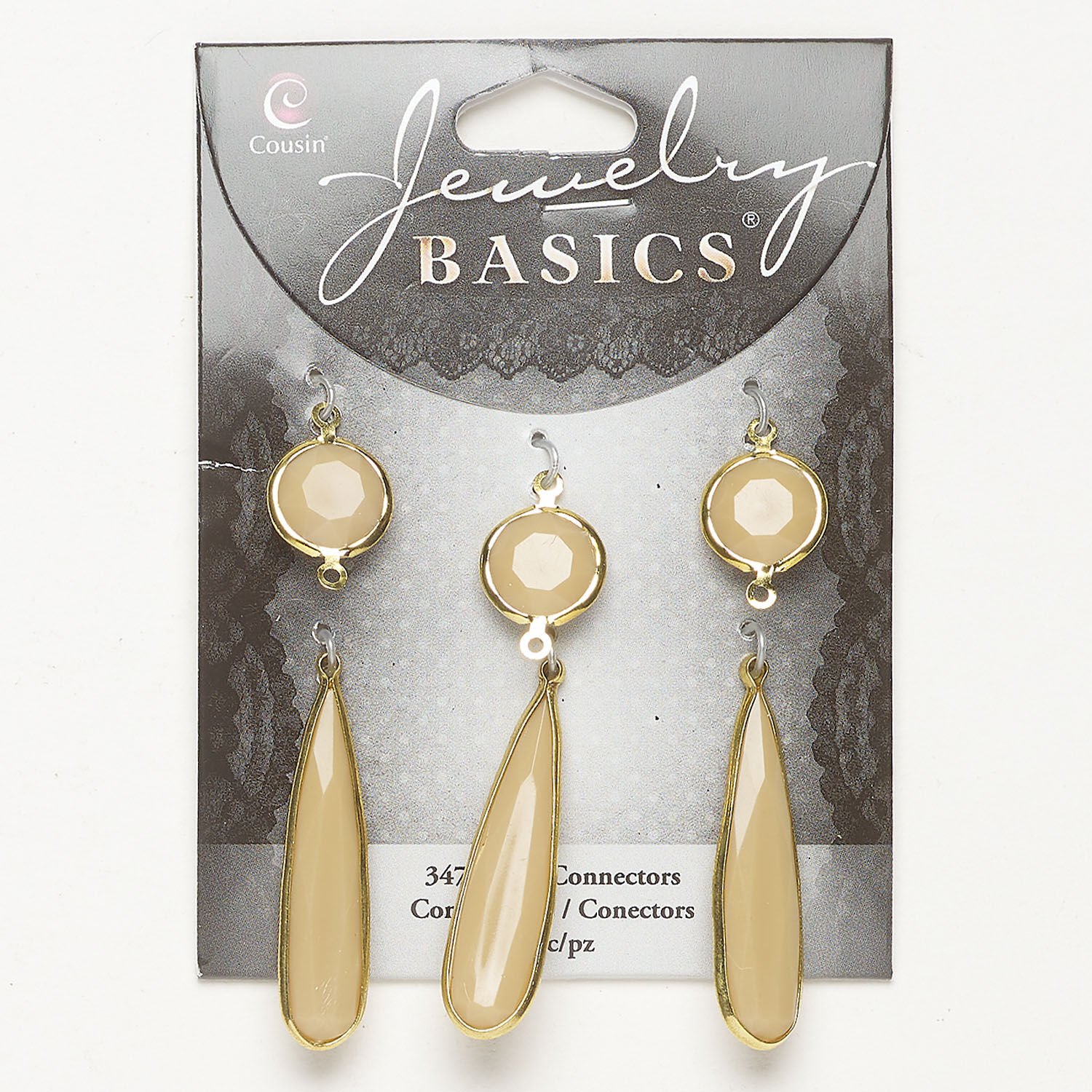 Link and focal assortment 1pkg6, gold-finished brass and acrylic, beige, 15mm double-sided faceted round / 40x9mm double-sided teardrop.