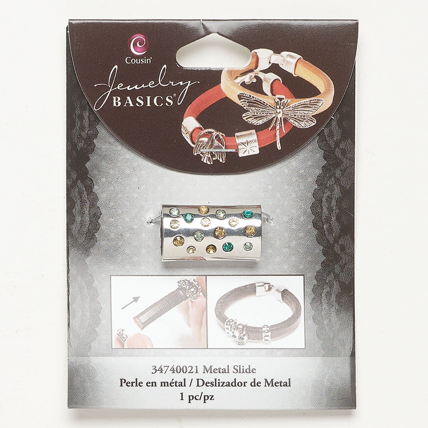 Slider bead 1pkg1, antique silver-finished brass and acrylic, multicolored, 24x14mm oval tube.