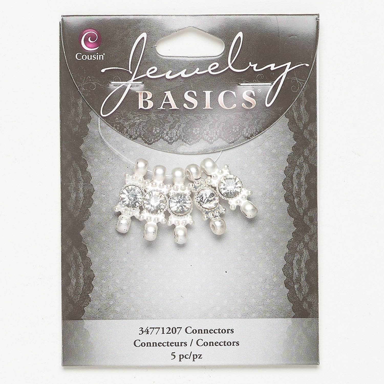 Link 1pkg5, matte silver-finished brass and acrylic, clear, 11x8mm fancy rectangle.