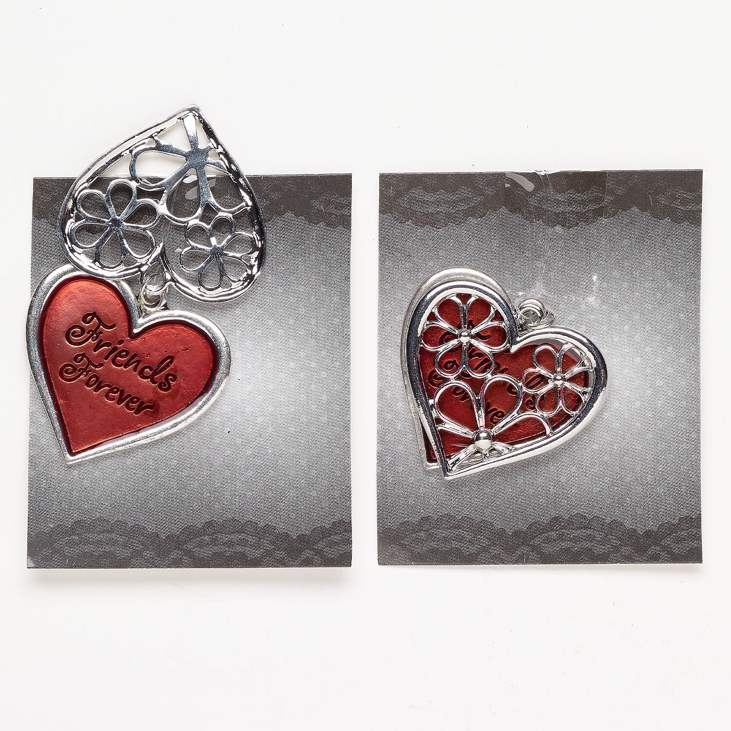Focal 2pkg2, enamel and silver-finished brass, red, 38x36mm single-sided heart with "Friends Forever" and 38x36mm heart with cutout flowers.