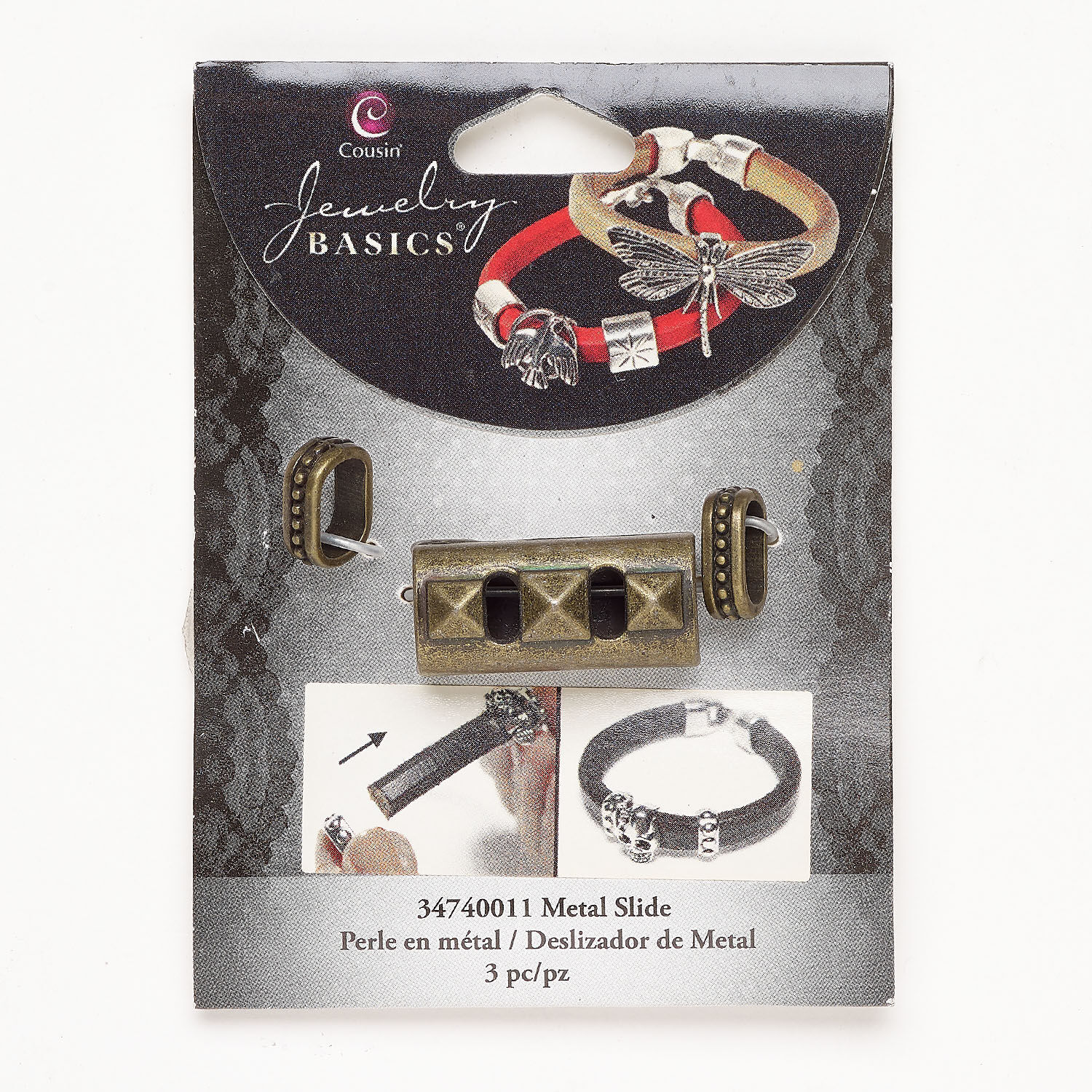 Bead assortment, slider 1pkg3, antique brass-finished "pewter" (zinc alloy), 13x5mm beaded oval rondelle and 28x13mm slotted rectangle.