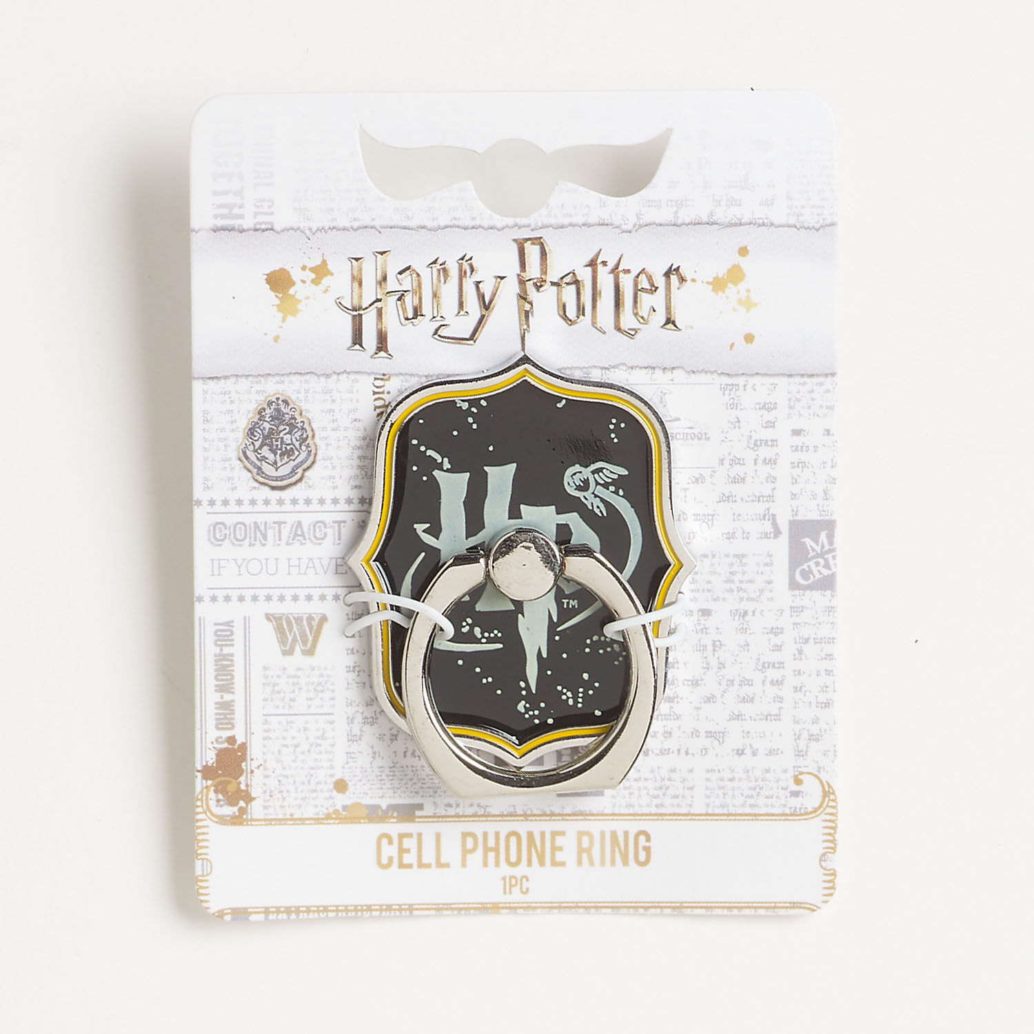 Cell phone ring 1pkg1, silver-finished brass and steel / enamel, black / white / yellow-orange, 45x38mm Harry Potter™ fancy rectangle.