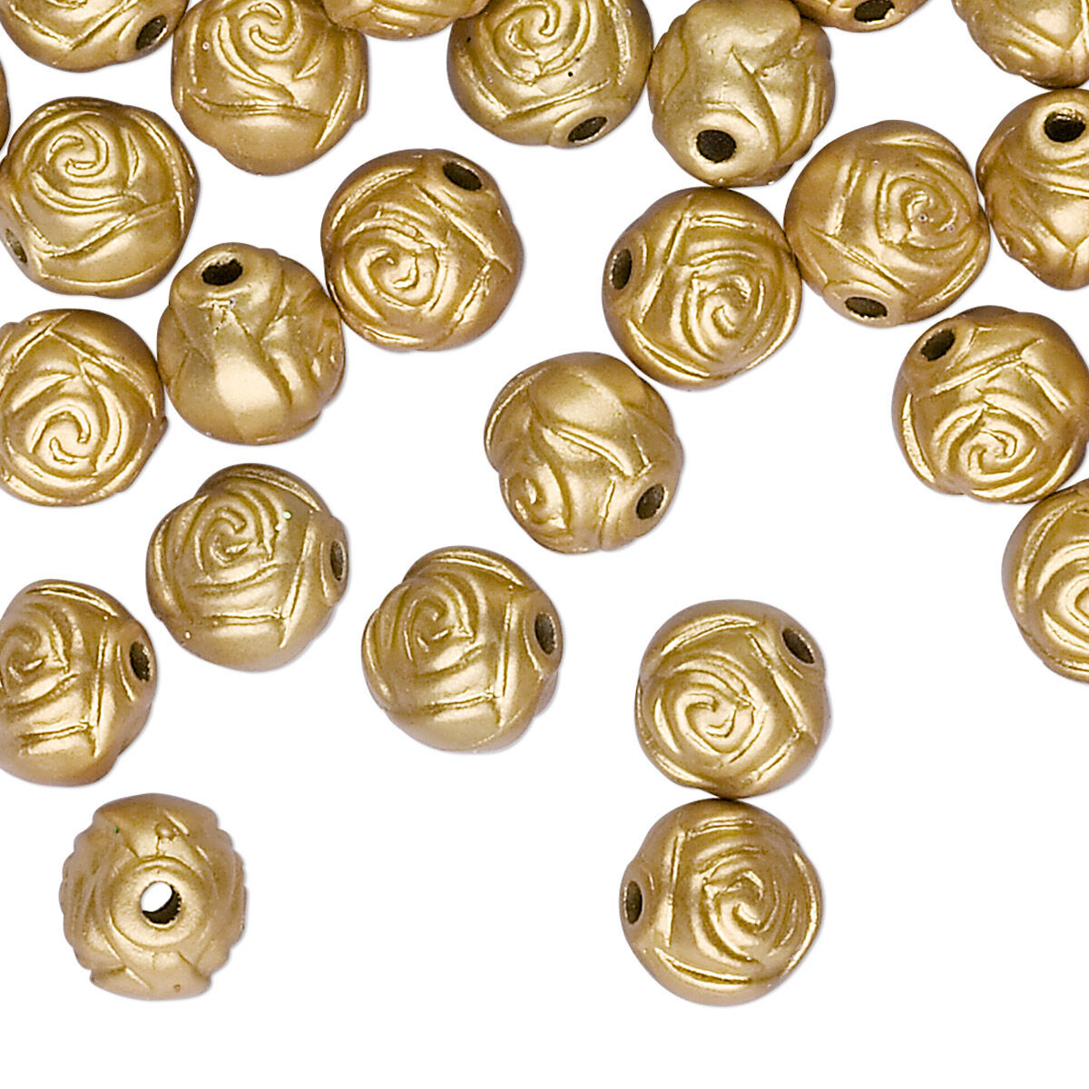 Bead, acrylic, opaque gold, 8mm round rose. Sold per pkg of 100.