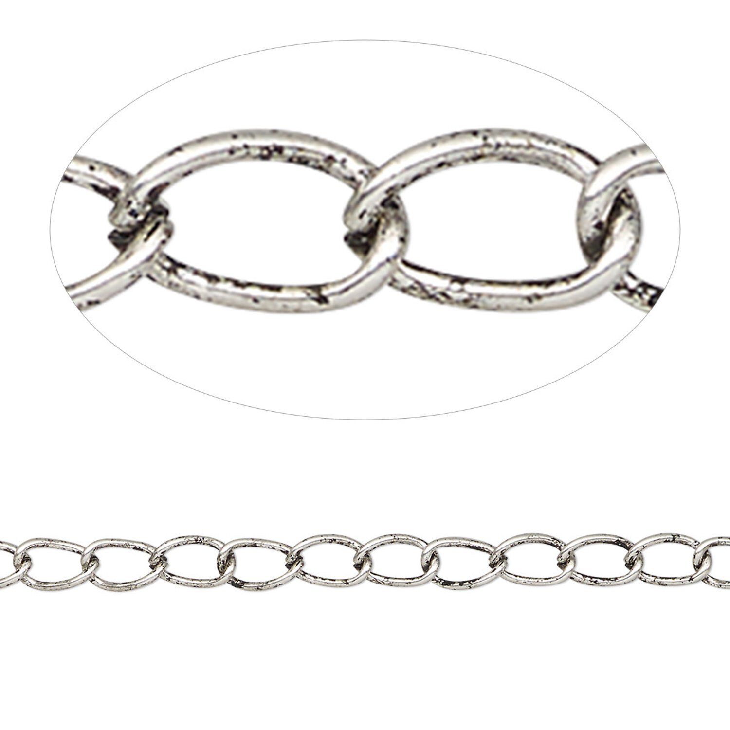 This steel curb chain features an antique silver plating and offers a cost-effective alternative to gold for the designer looking to save a buck. Recommended for use with lightweight designs.