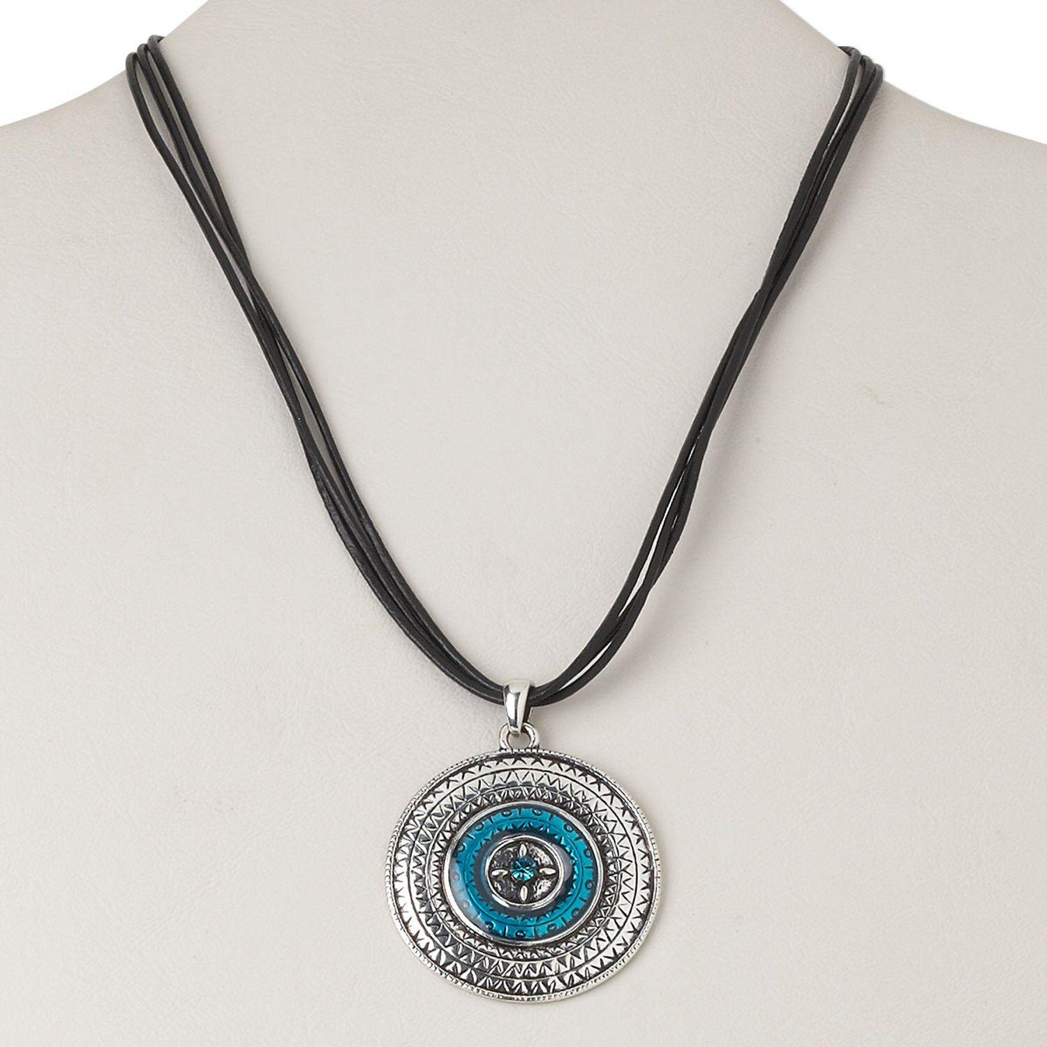 Necklace, antiqued silver-finished "pewter" (zinc-based alloy) and steel and/or brass / enamel / leather / Czech glass rhinestone, teal and black, 43mm flat round, 16 inches with lobster claw clasp and 3-1/2 inch extender chain. Sold individually.