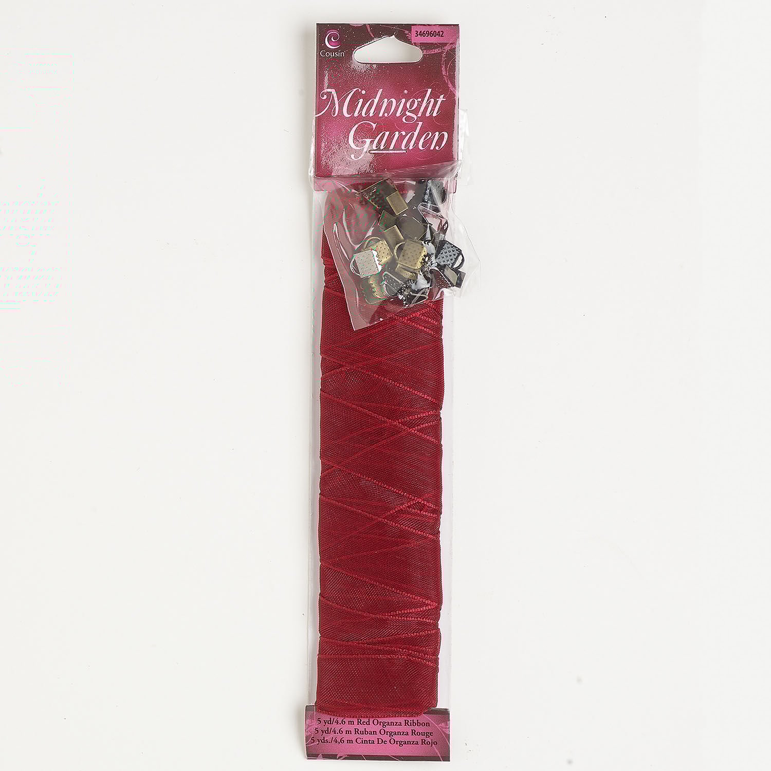Ribbon and findings assortment 1pkg25, mixed-finish steel and organza, scarlet, 15mm flat ribbon.