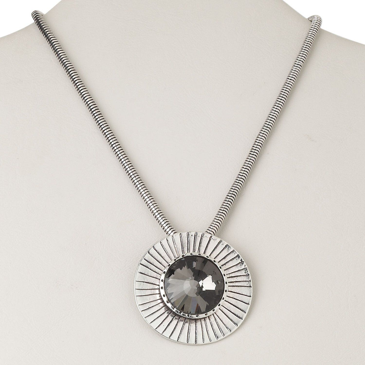 Necklace, Czech glass rhinestone and antiqued silver-finished "pewter" (zinc-based alloy) and steel and/or brass, smoky grey, 51mm flat round with 26mm faceted round, 16 inches with lobster claw clasp and 3-1/2 inch extender chain. Sold individually.