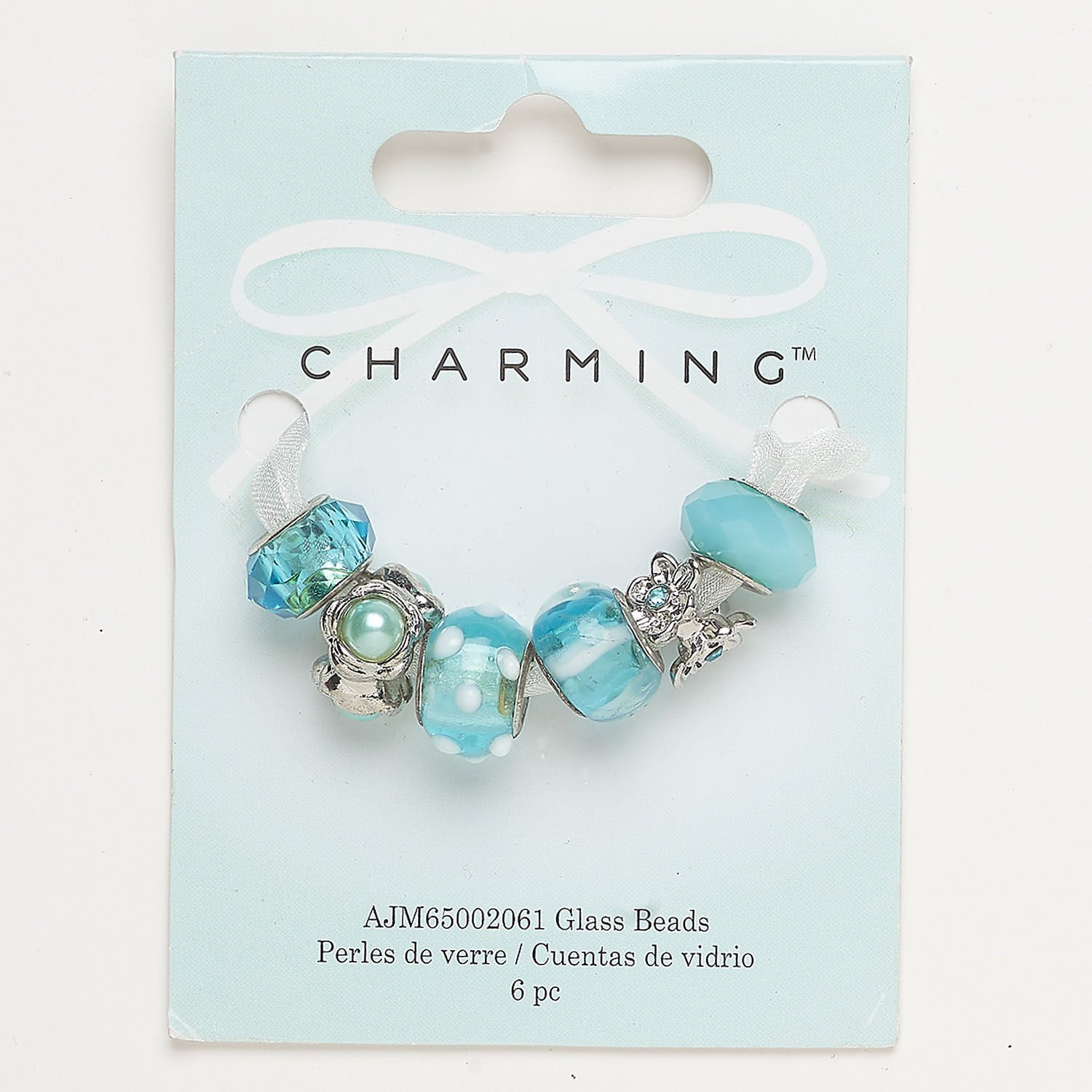 Bead assortment 1pkg6, silver-finished brass and glass, blue and white, 11x9mm-15.5x10mm rondelles.