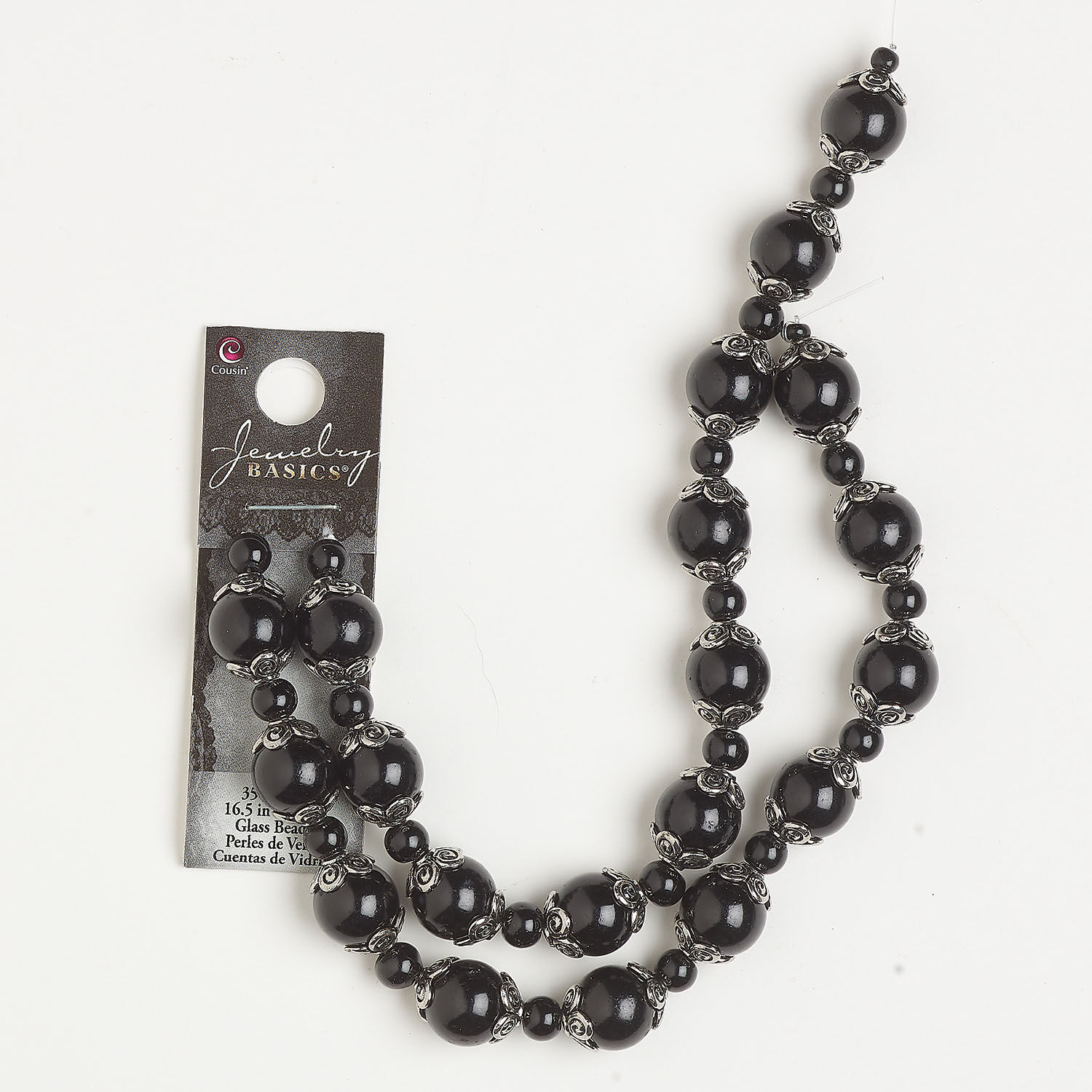 Bead assortment 1pkg80, antique silver-finished "pewter" (zinc alloy) and glass, black, 5mm round / 11mm round / 10x5mm flower bead cap, fits 9-11mm beads, 15.5-16 inches.