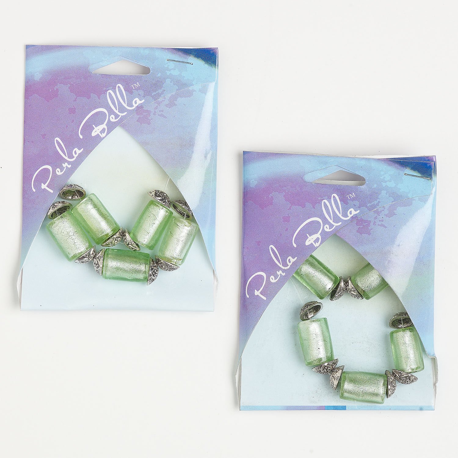 Bead assortment 1pkg30, antique silver-finished "pewter" (zinc alloy) and lampworked glass, green with silver-colored foil, 16x13mm cylinder / 10x5mm bead cap, fits 9-11mm beads.