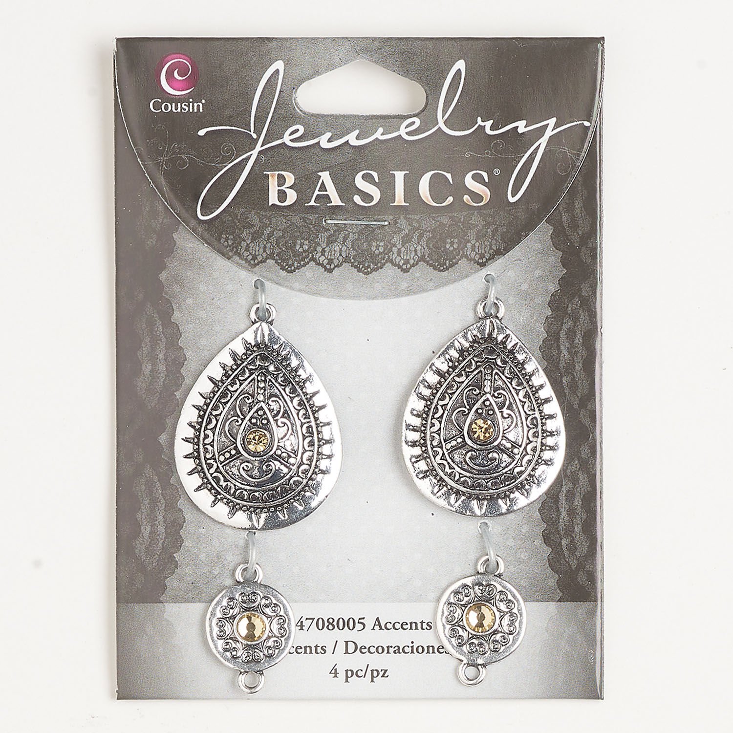 Link and focal assortment 1pkg4, antique silver-finished brass and acrylic, tan, 13mm round and 30x24mm teardrop.