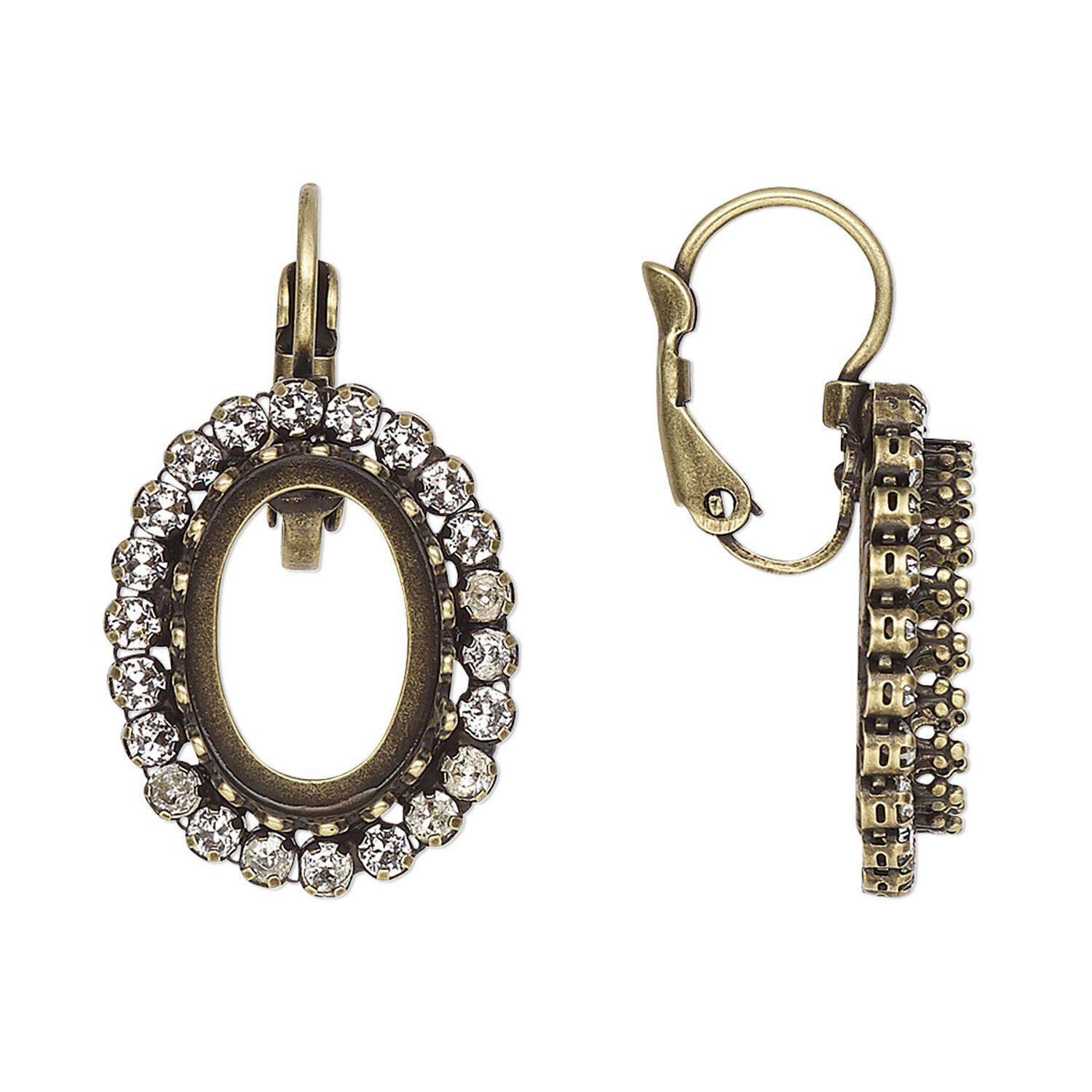 These leverback ear wires, specifically made to accommodate crystals 14x10mm faceted oval fancy stone (4120) chatons, have gallery wire bezels that are easily pushed down with a bezel pusher. The antique brass plating is a customer-favorite metal tone for creating vintage-inspired jewelry.