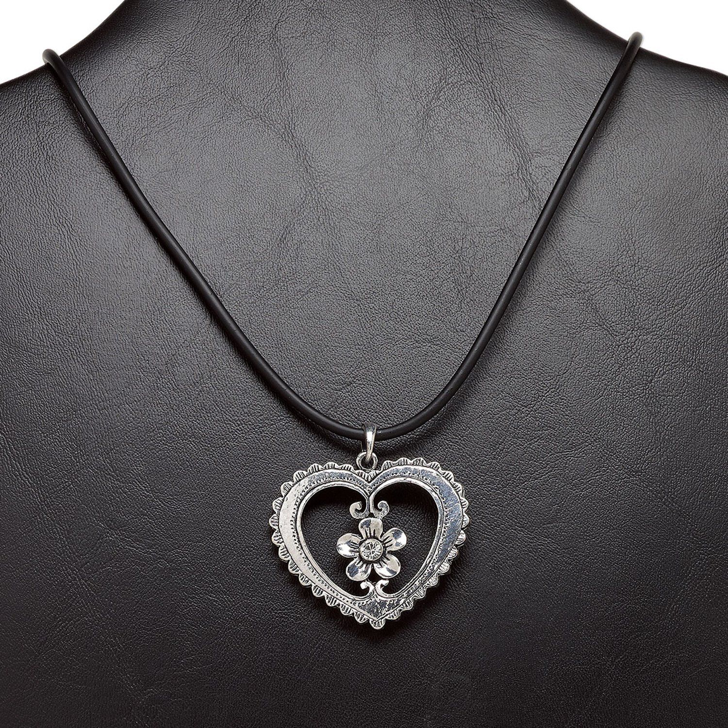 Necklace, glass rhinestone / plastic / antique silver-plated steel / "pewter" (zinc-based alloy), black and clear, 48x40mm open heart with flower, 21 inches with 3-inch extender chain and lobster claw clasp. Sold individually.