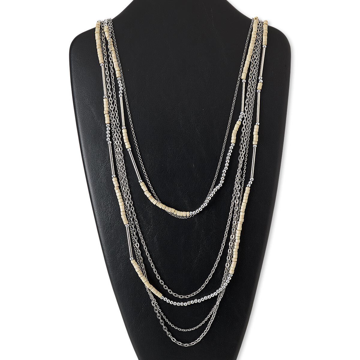 Necklace, stained wood / silver-coated plastic / imitation rhodium-plated steel / brass, tan, flat round, 32 inches with 2-inch extender chain and lobster claw clasp. Sold individually.