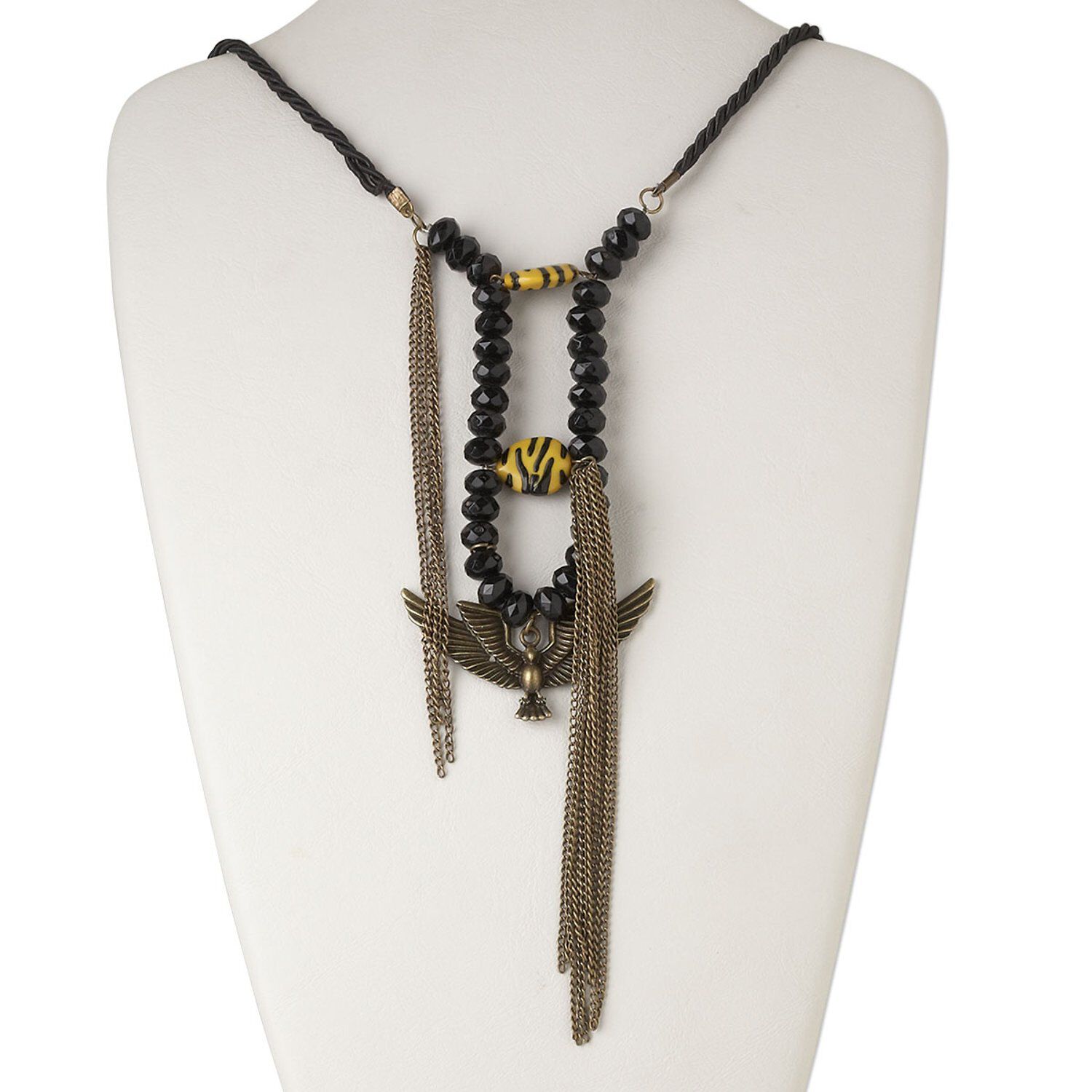Necklace, antiqued brass / nylon / steel, black and yellow, 66x34mm single-sided eagle, 30-inch continuous loop. Sold individually.