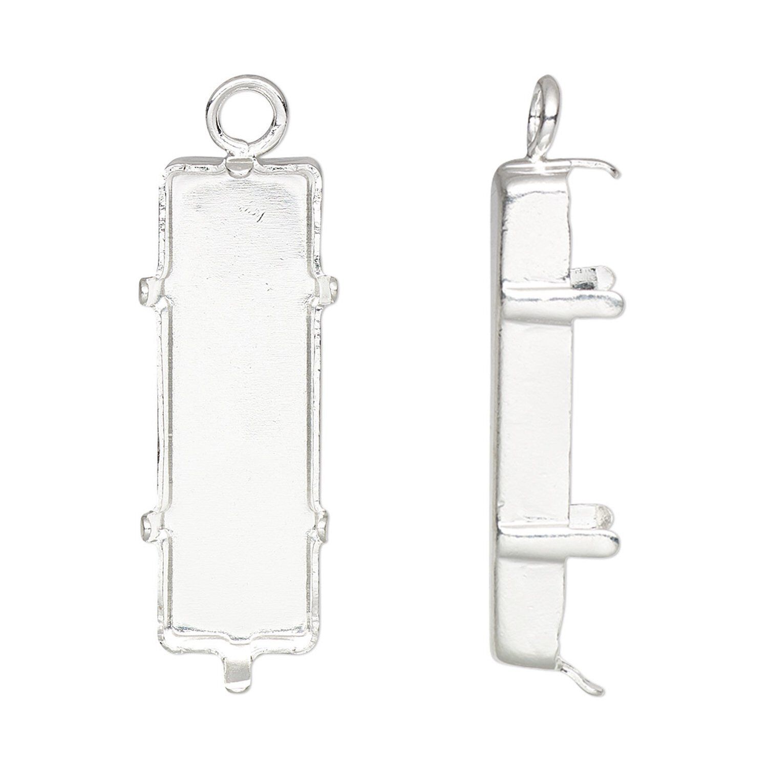 Drop, silver-plated brass, 25x9mm rectangle with closed loop and 24x8mm 6-prong faceted rectangle setting (4547) with closed back. Sold per pkg of 4.