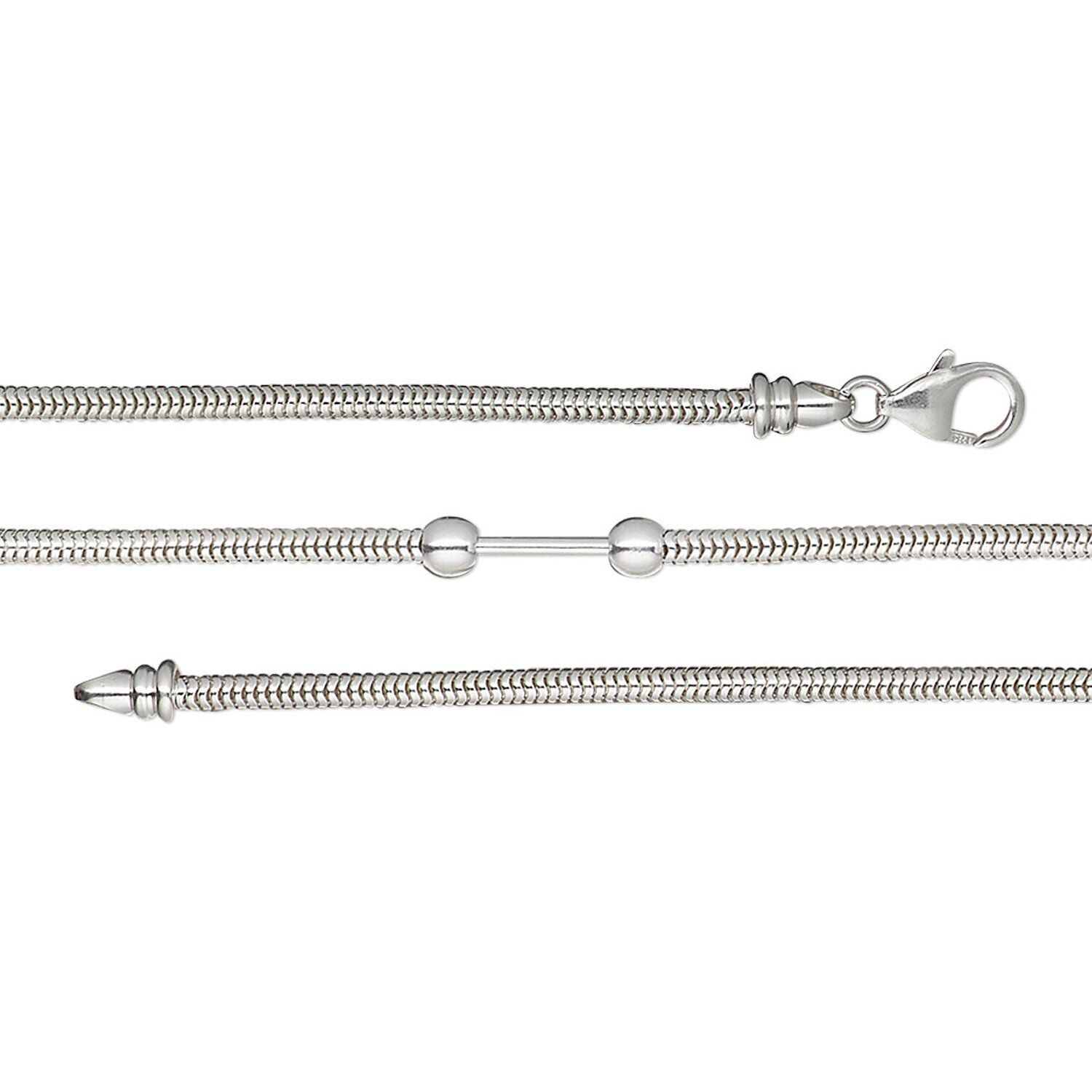 Chain, sterling silver, 3mm snake, 8 inches with lobster claw clasp, (2) twist off ball end and end caps with 10x1.6mm bar. Sold individually.