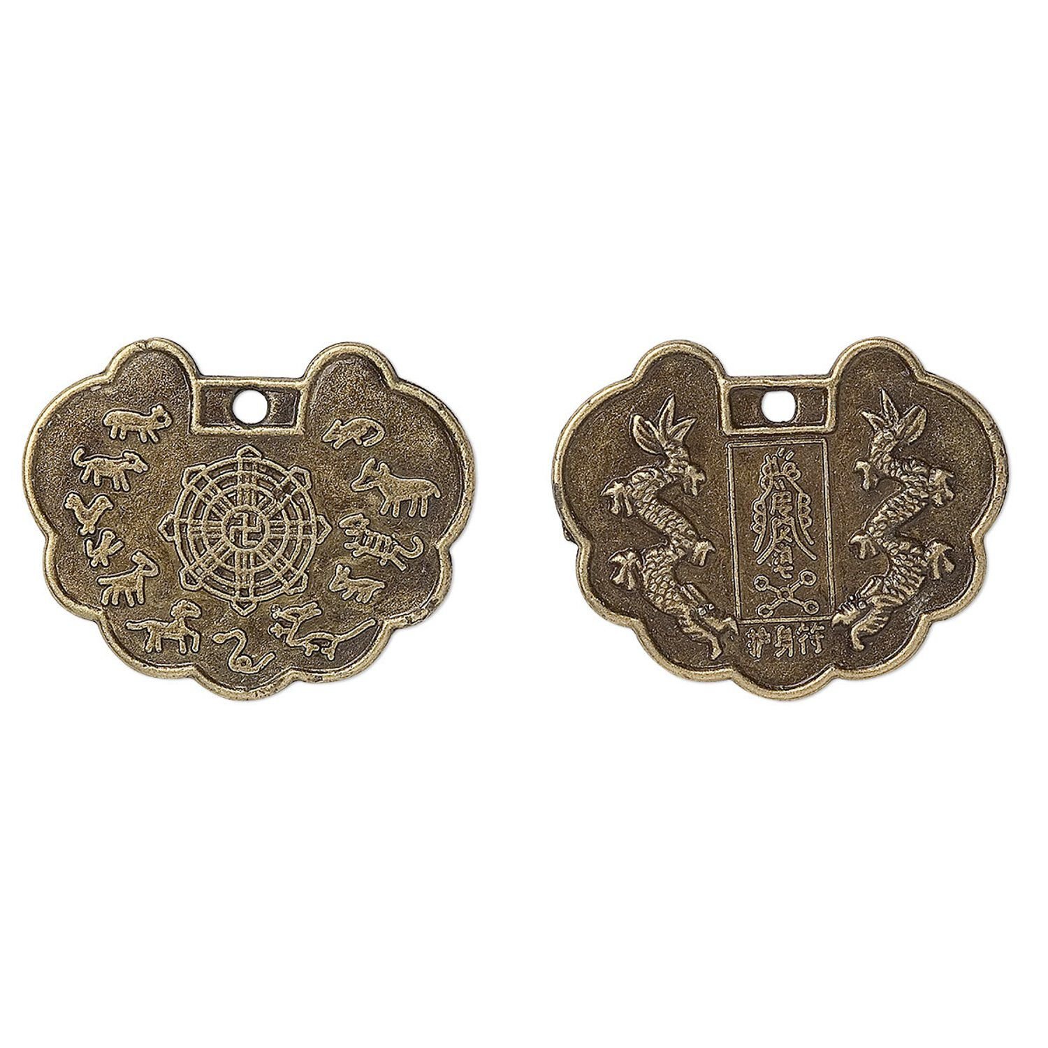 Focal, antique brass-plated "pewter" (zinc-based alloy), 30x23mm Chinese Zodiac "protective talisman." Sold per pkg of 50.