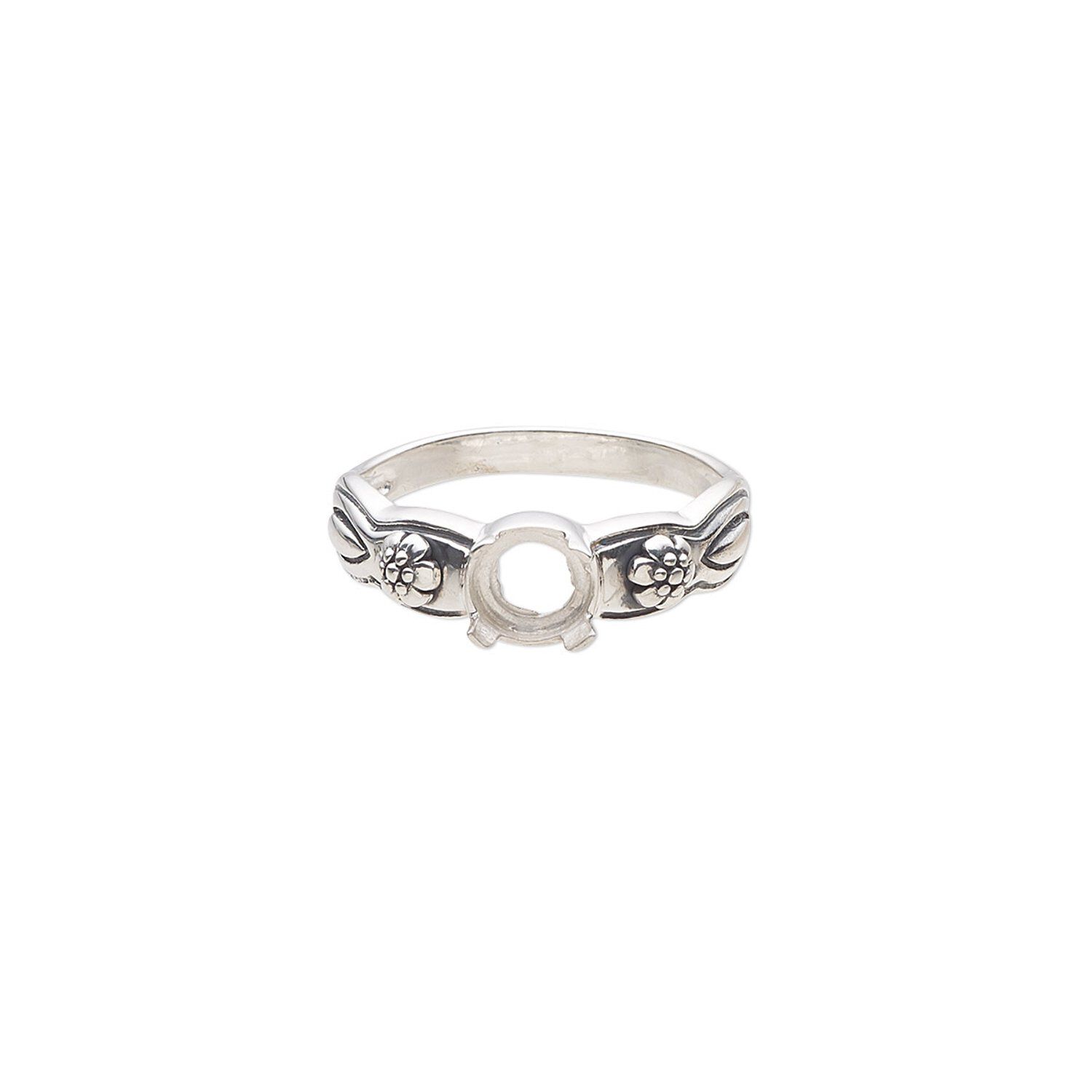 Designer-favorite sterling silver finger ring with attractive floral pattern features a detail-enhancing antiqued finish and a 4-prong open-backed setting designed to accept a 6mm round cabochon.
