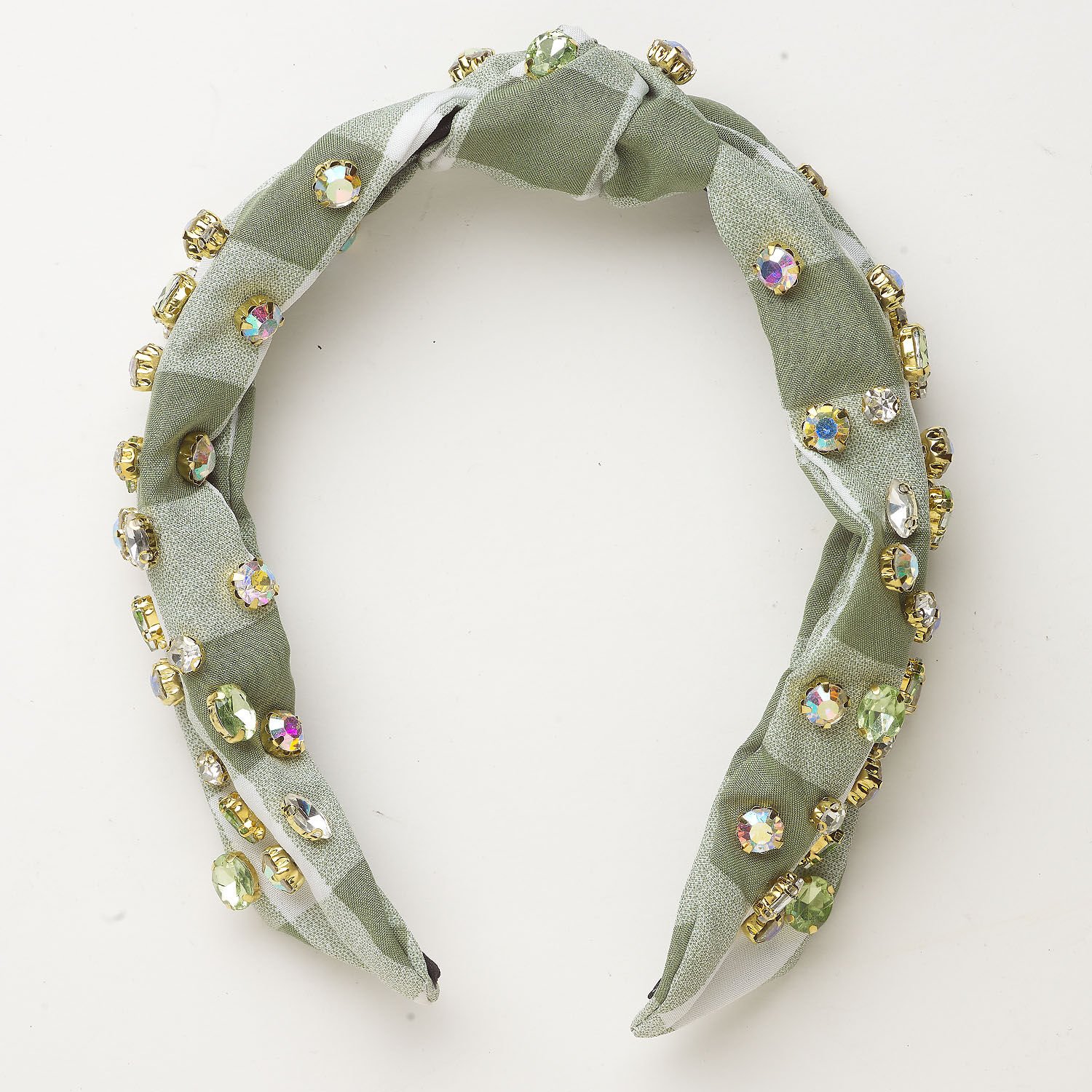 Cloth-covered headband measures 16 inches long and 30mm wide with a gingham pattern, accented by sparkling glass rhinestones.
