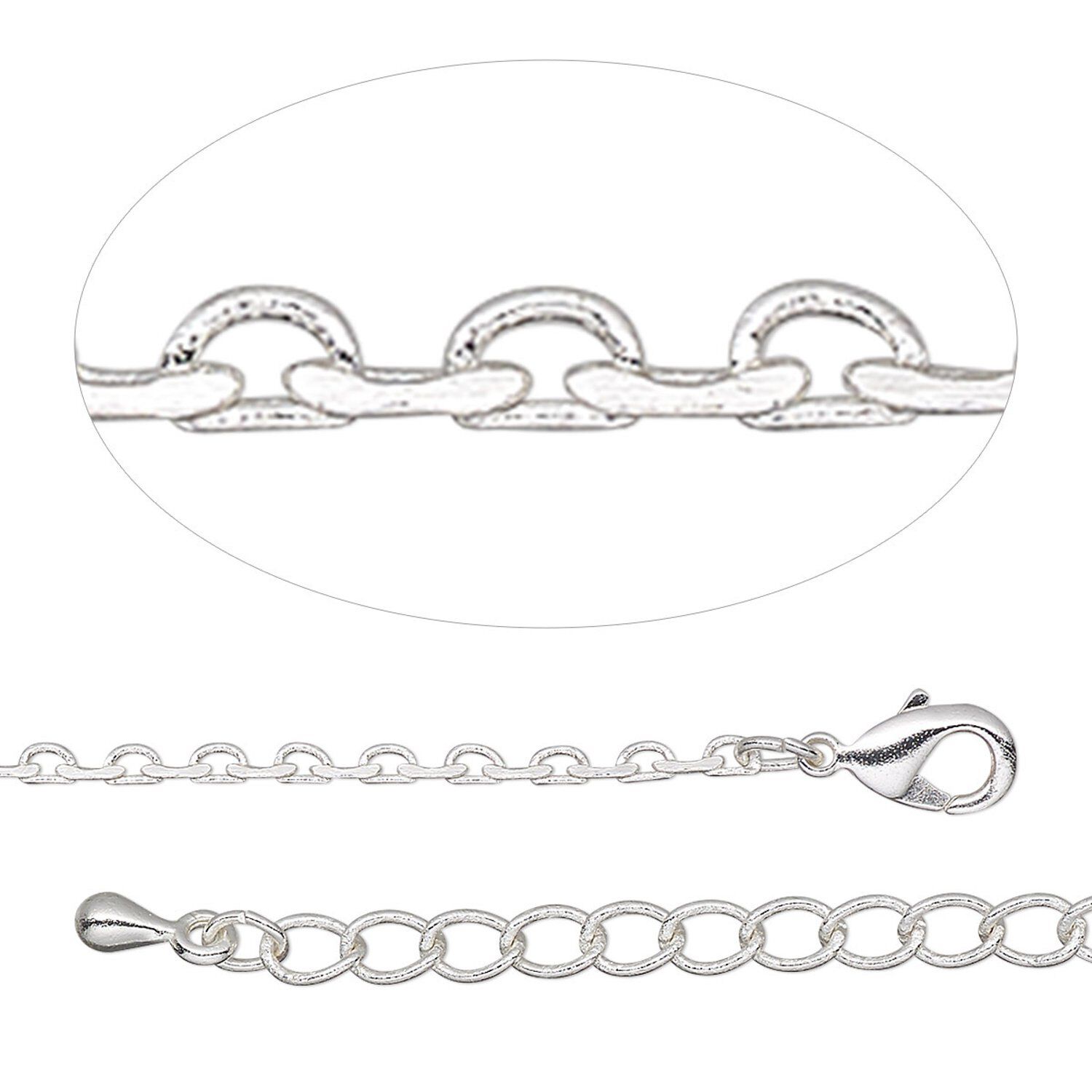 Chain, silver-plated brass, 1.8mm half oval cable, 18 inches with 2-inch extender chain and lobster claw clasp. Sold individually.