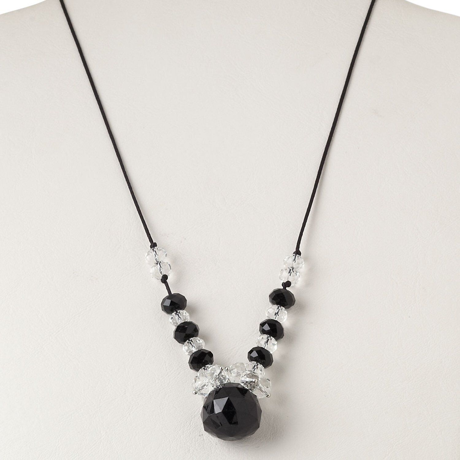 Soft black nylon cord features faceted clear and black glass rondelles and a black faceted teardrop focal. Ready-to-wear necklace is ideal for gift-giving, counter sales or extending current jewelry lines. Colors, shapes and sizes may vary in each lot.