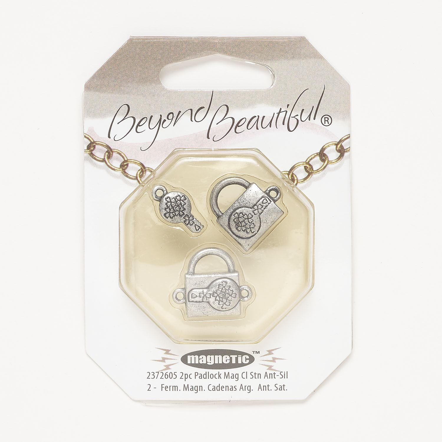 Clasp magnetic 1pkg2, 18x14mm 2-sided lock & key, antique silver-finished brass 1-strand