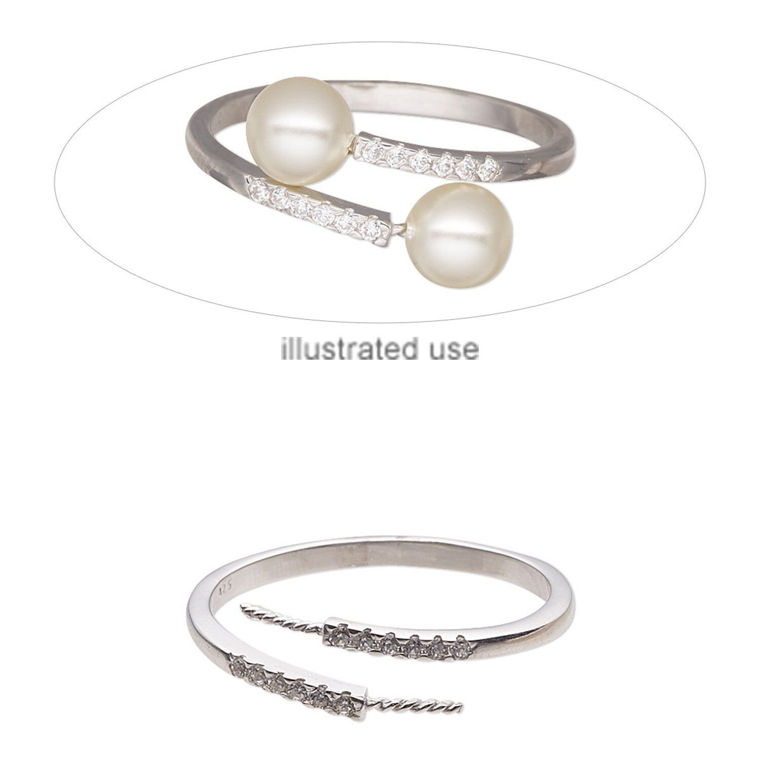 Ring, cubic zirconia and sterling silver, clear, 5.5mm wide with (2) 5mm twisted pegs, fits up to 6mm half-drilled round bead, size 9. Sold individually.