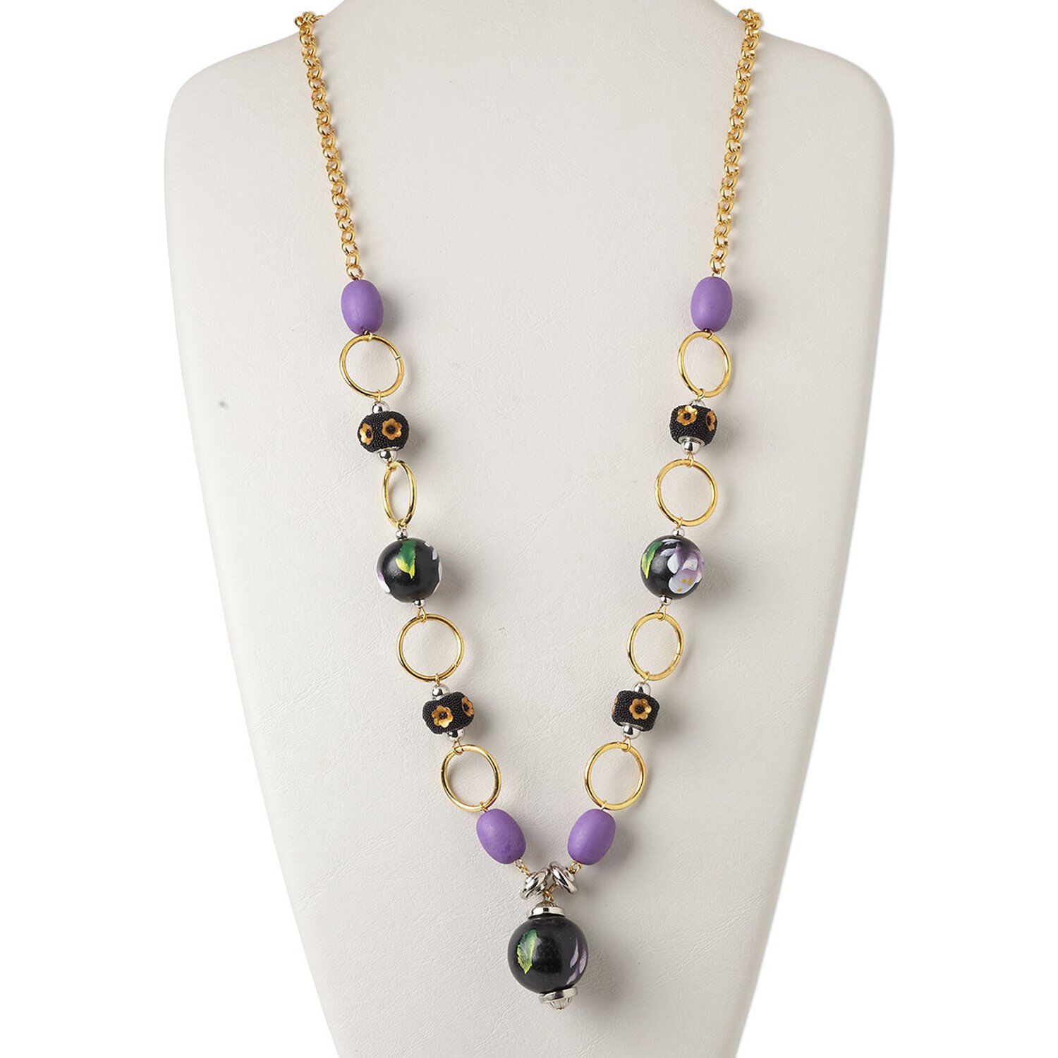 Necklace, polymer clay / acrylic / glass / painted wood / gold-finished steel / gold-coated plastic, multicolored, 23mm round with flower and leaf design, 27 inches with 1-1/2 inch extender chain and lobster claw clasp. Sold individually.