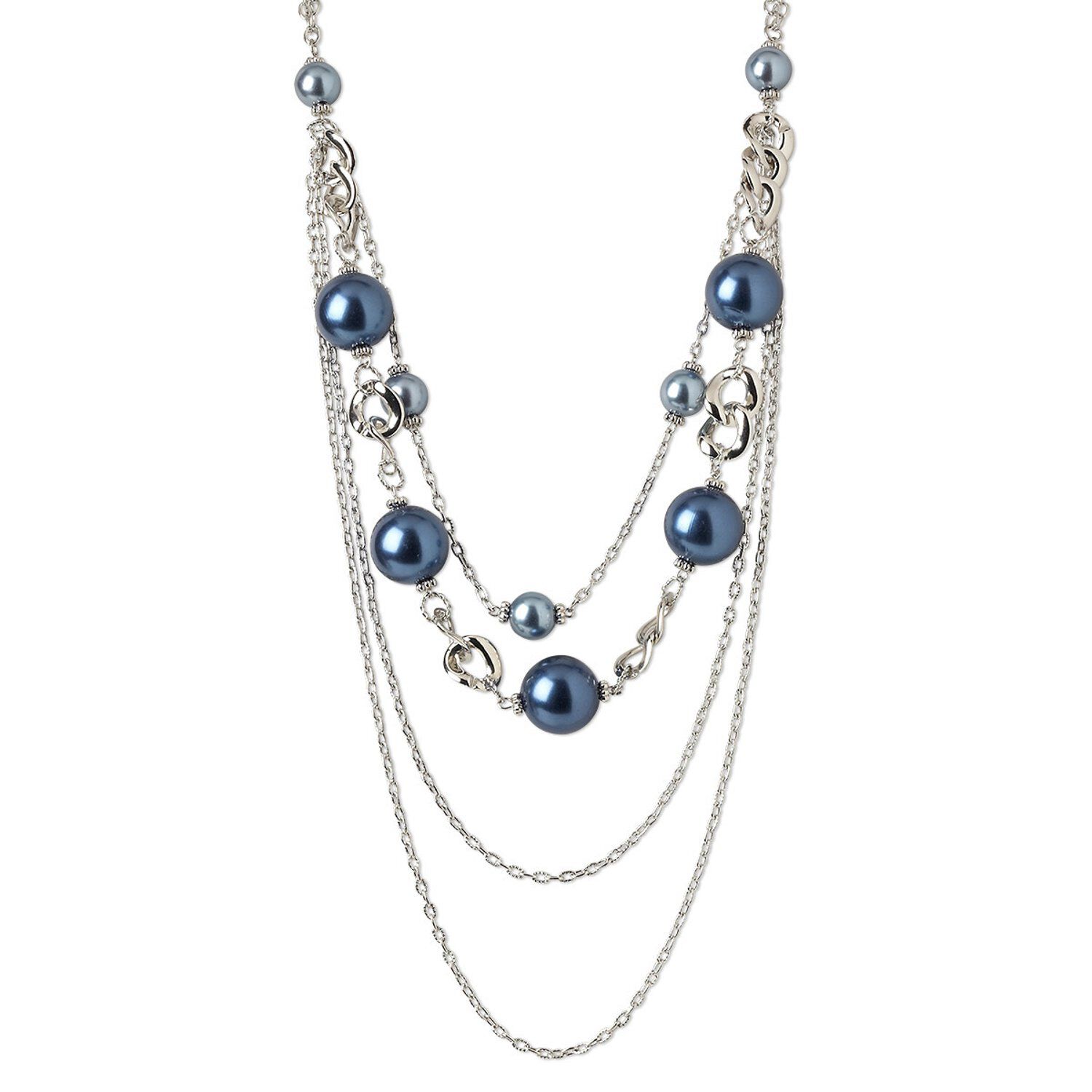 Silver-plated steel chain and brightly colored glass-based pearls give a contemporary twist to a classic style. Necklace goes from 4 strands to 1 strand. The overall necklace length measures 35 inches. Colors, shapes and sizes may vary in each lot.