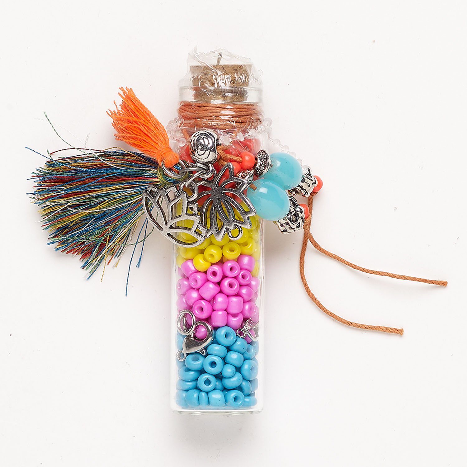 • (1) reusable glass bottle with cork, containing 24 grams of seed beads in four colors
