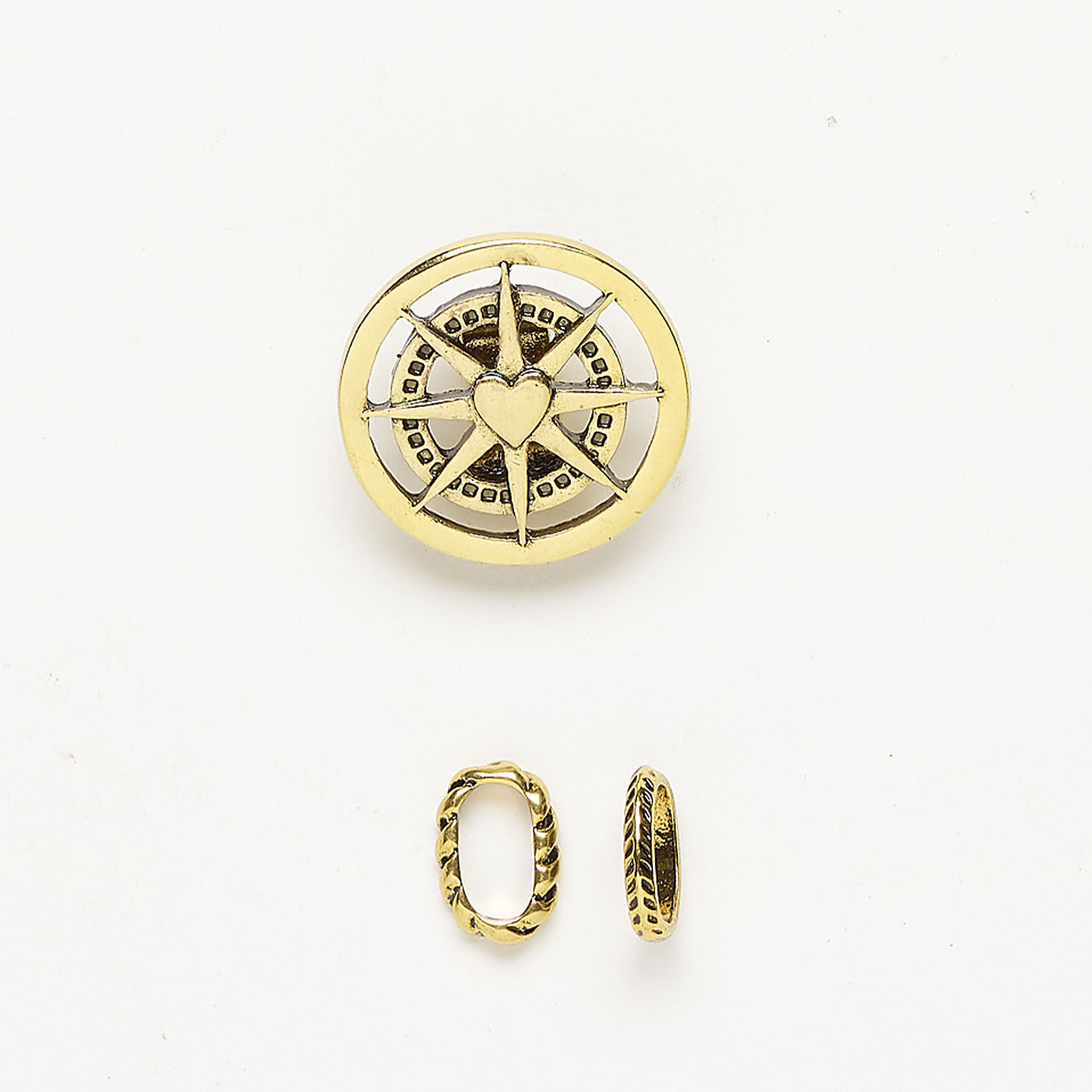 Slider bead 1pkg3, antique gold-finished brass and stainless steel, 26mm compass / 13x2mm textured rondelle / 14x3mm twisted rondelle.