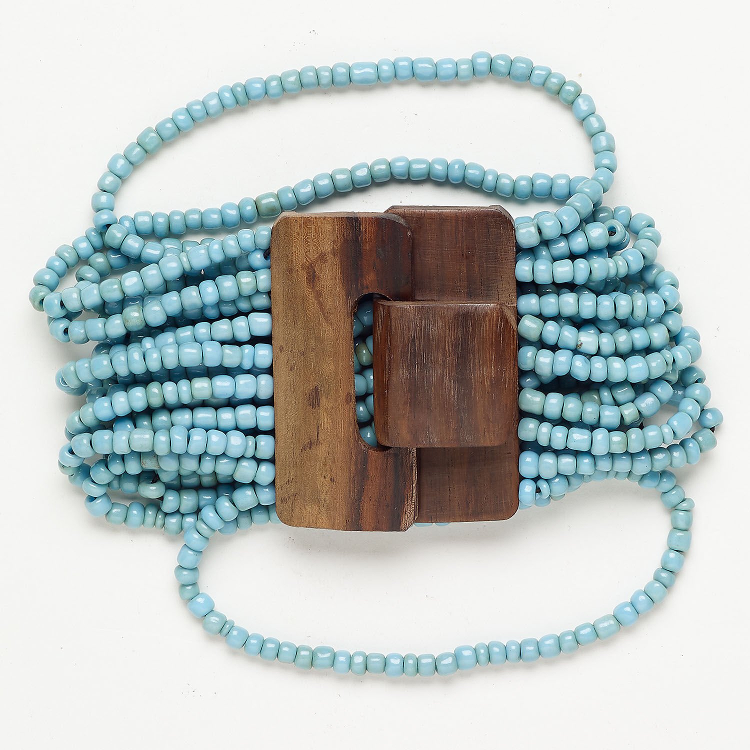 Multiple strands of colorful glass beads and a bold wood hook-and-eye clasp give an on-trend look to this bracelet. Ready-to-wear bracelet makes a terrific gift or great for counter sales.