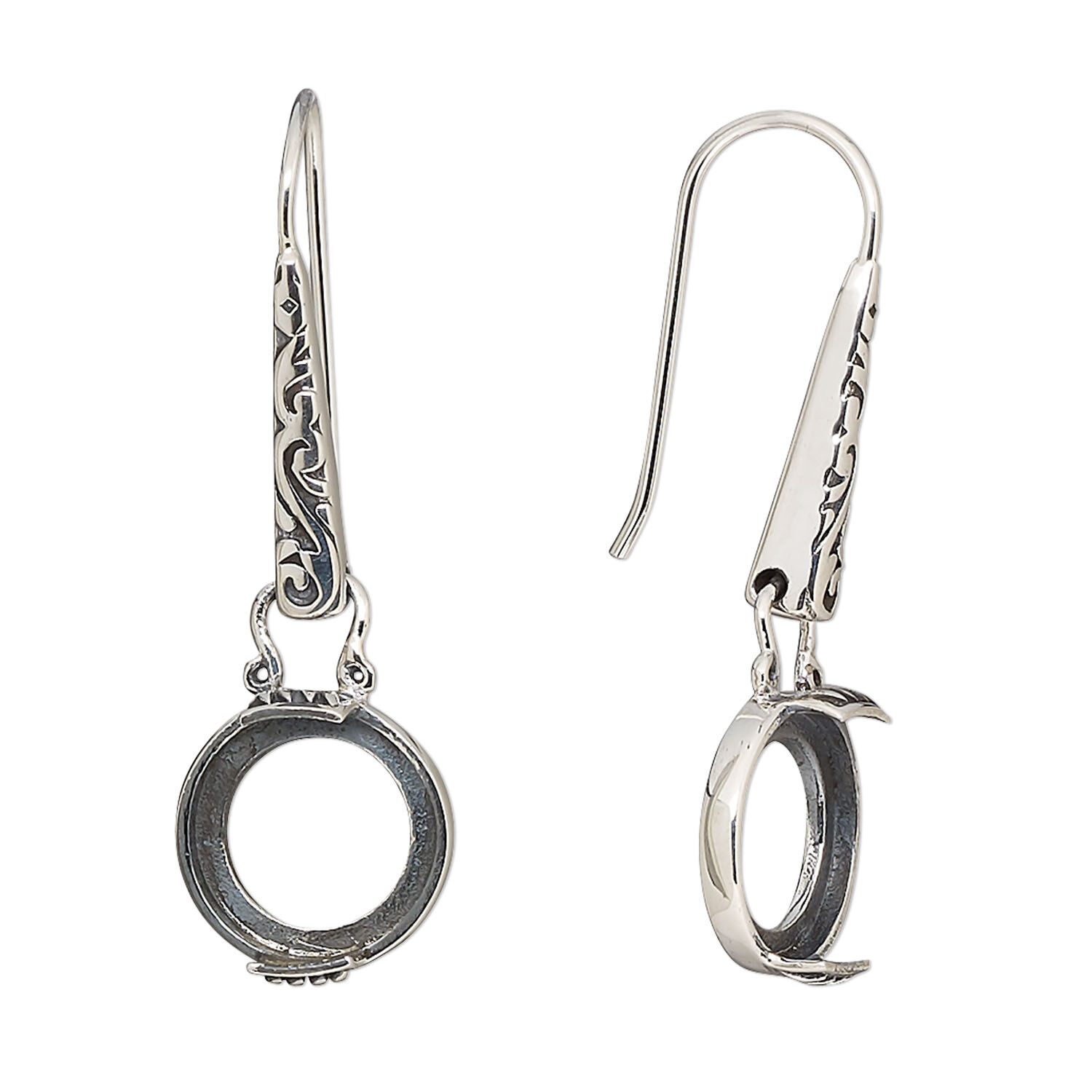 Beautiful sterling silver earrings have antiquing to enhance the flourish design. Add 10mm round cabochons to the 2-prong settings for custom earring designs. Earrings have an anti-tarnish coating.