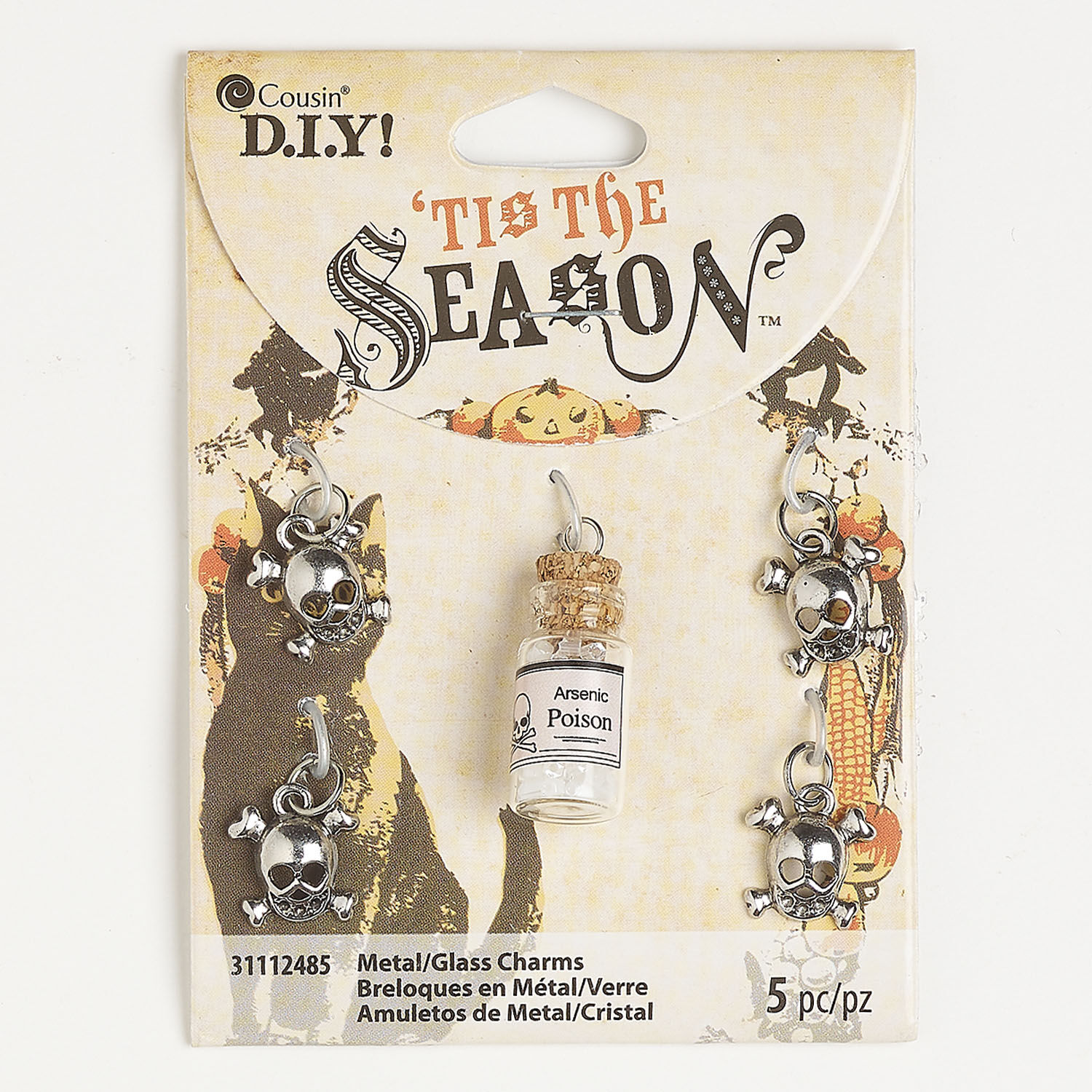 Charm and drop assortment 1pkg5, antique silver-finished "pewter" (zinc alloy) and steel / glass, clear and brown, 13mm skull and crossbones / 29x11mmmm bottle with cork and "Poison" label.